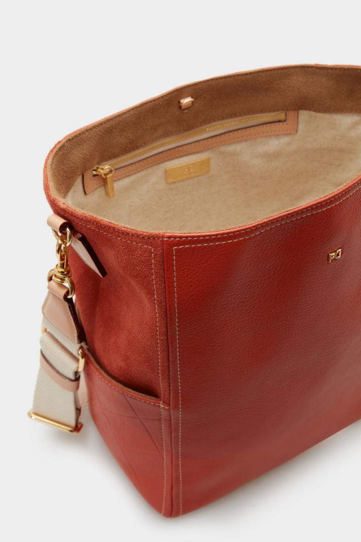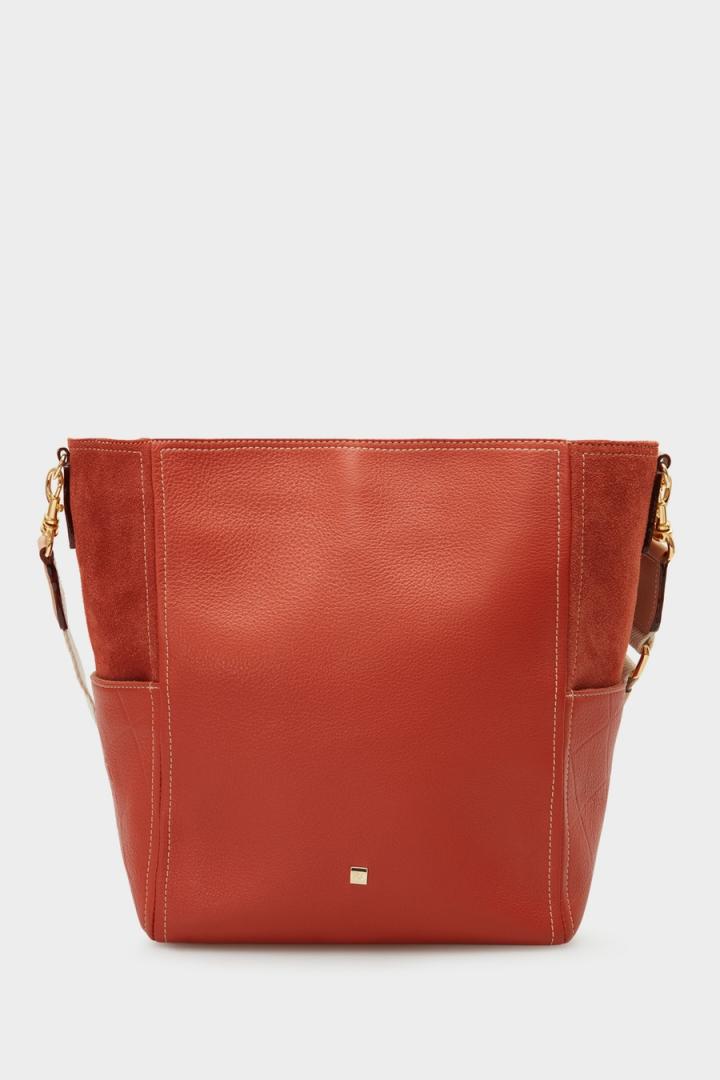 Bolso de hombro en piel con diseño de bolsillos tipo parche en los laterales. Asa de hombro extraíble y regulable de grosgrain a contraste, interior de gran capacidad con forro completo de algodón y lino y un bolsillo con cierre de cremallera.