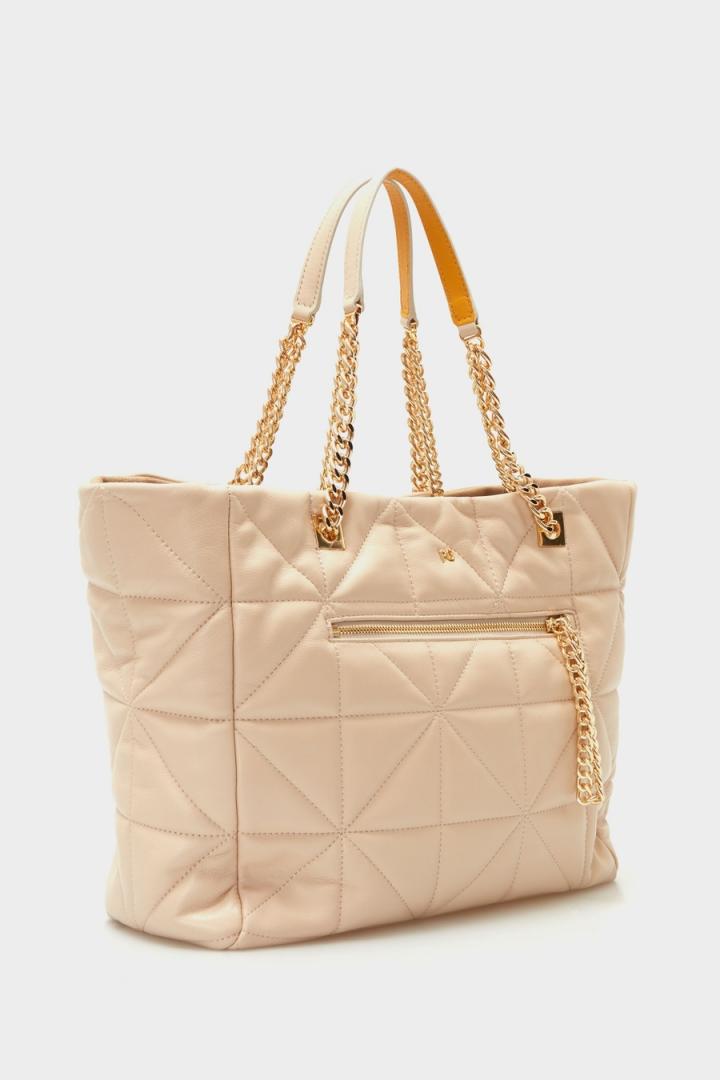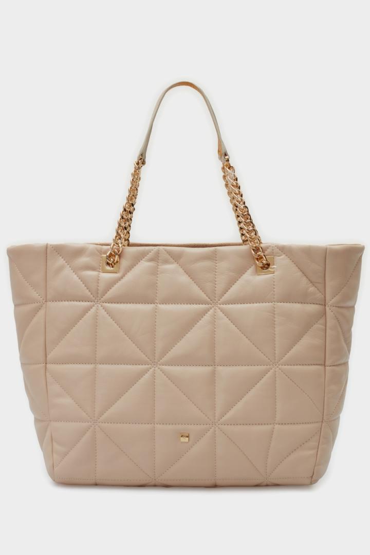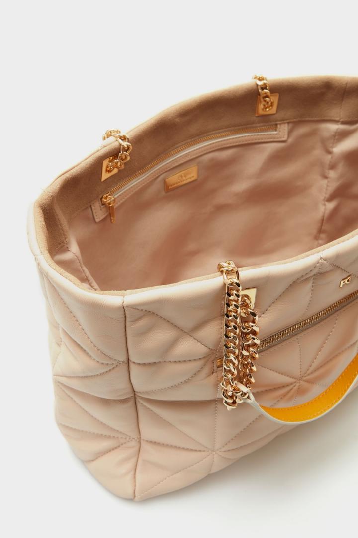Bolso de hombro en piel con diseño acolchado Pop Origami. Dos asas de cadena combinadas con piel y un bolsillo exterior con cremallera y detalle de cadena. Interior con forro completo y un bolsillo de cremallera.