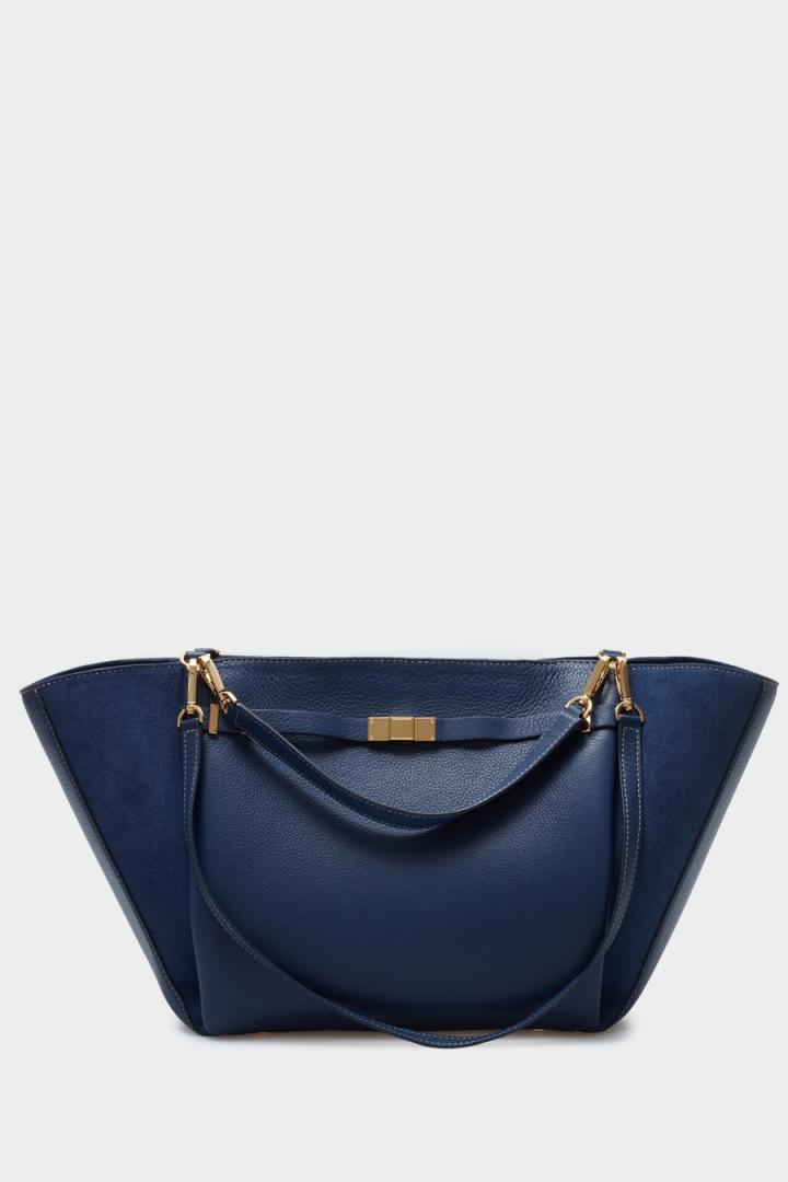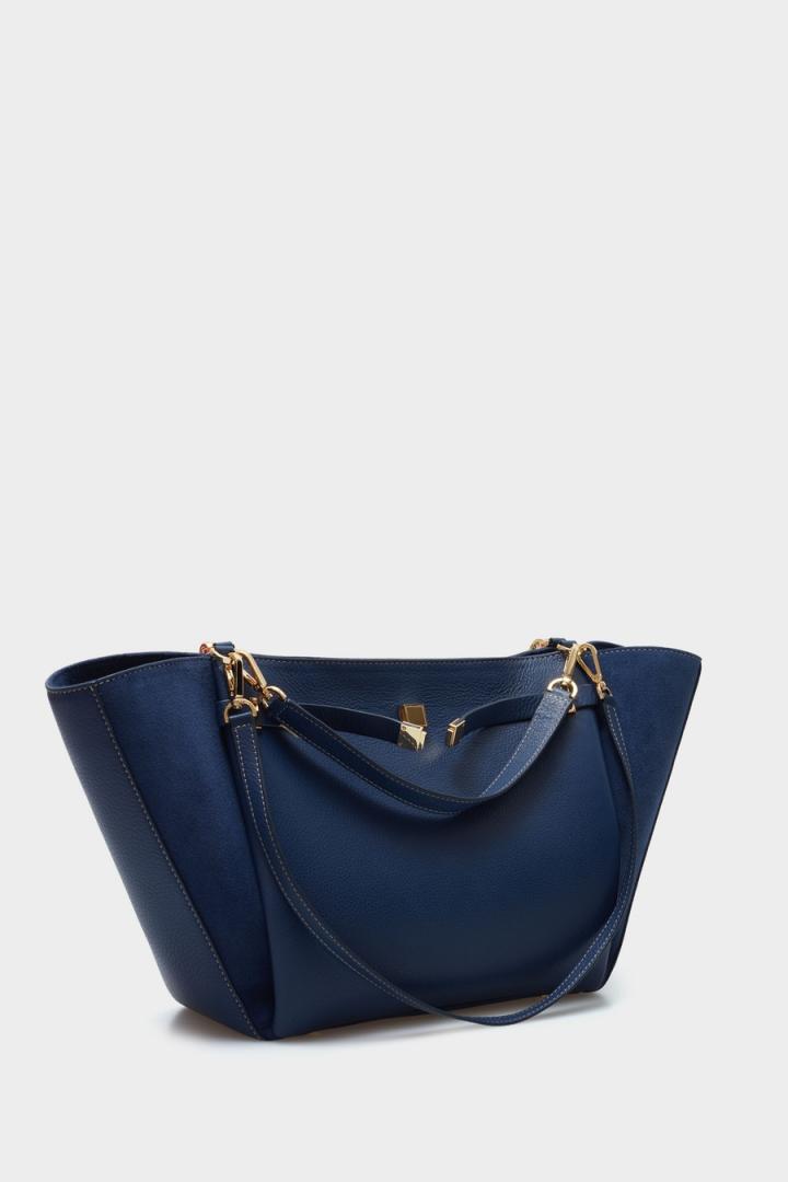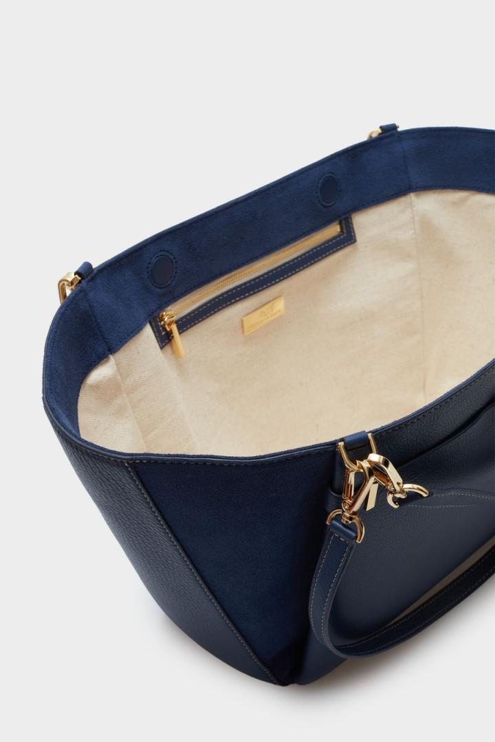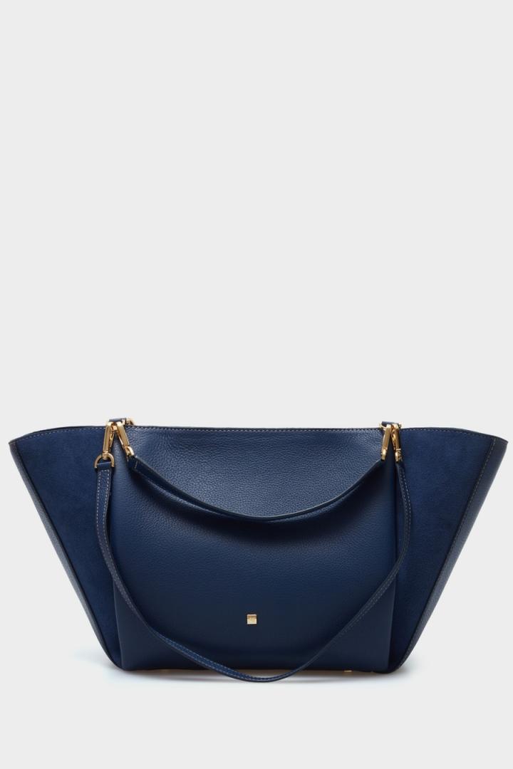 Bolso de hombro grande en piel con detalle de tira de piel y placa metálica con cubo en el delantero y paneles de ante a tono. Doble asa de mano de piel y doble asa de hombro de piel, todas extraíbles. Cierre de imán oculto e interior con forro completo de algodón y lino con un bolsillo de cremallera.