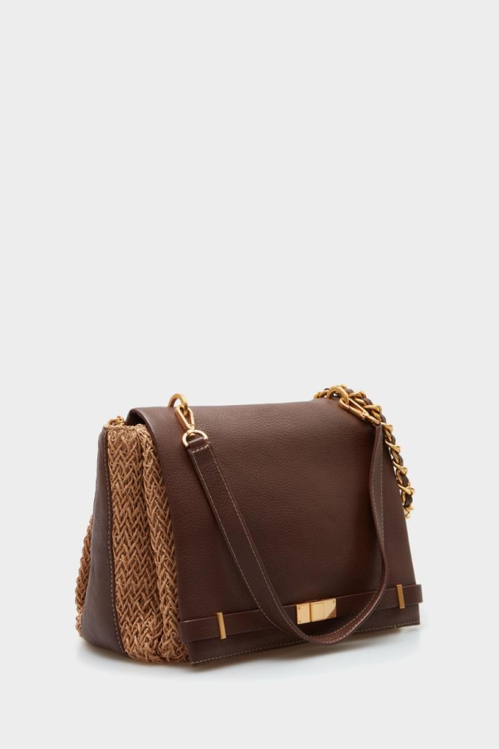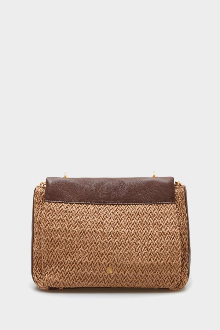 Bolso de hombro mediano en fibra de papel trenzada con solapa y laterales en piel y tira de piel y placa me…