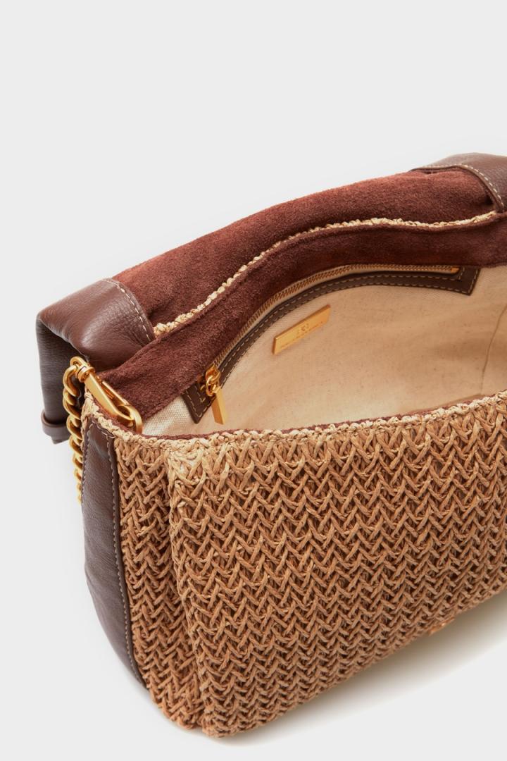 Bolso de hombro mediano en fibra de papel trenzada con solapa y laterales en piel y tira de piel y placa metálica en forma de cubo en el delantero. Cierre de solapa con broche magnético e interior en ante, asa de mano de piel extraíble y asa de hombro de cadena con piel trenzada. Interior con forro completo de algodón y lino con un bolsillo de cremallera. Detalle de logo cubo metálico en la parte posterior.