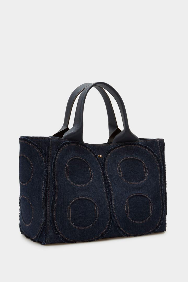 Bolso mediano en denim desflecado con diseño troquelado de ochos. Cierre de imán oculto y doble asa de hombro de piel. Interior con forro completo de algodón y un bolsillo con cierre de cremallera.