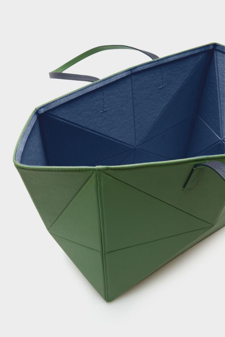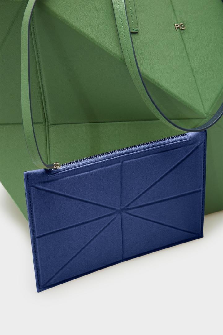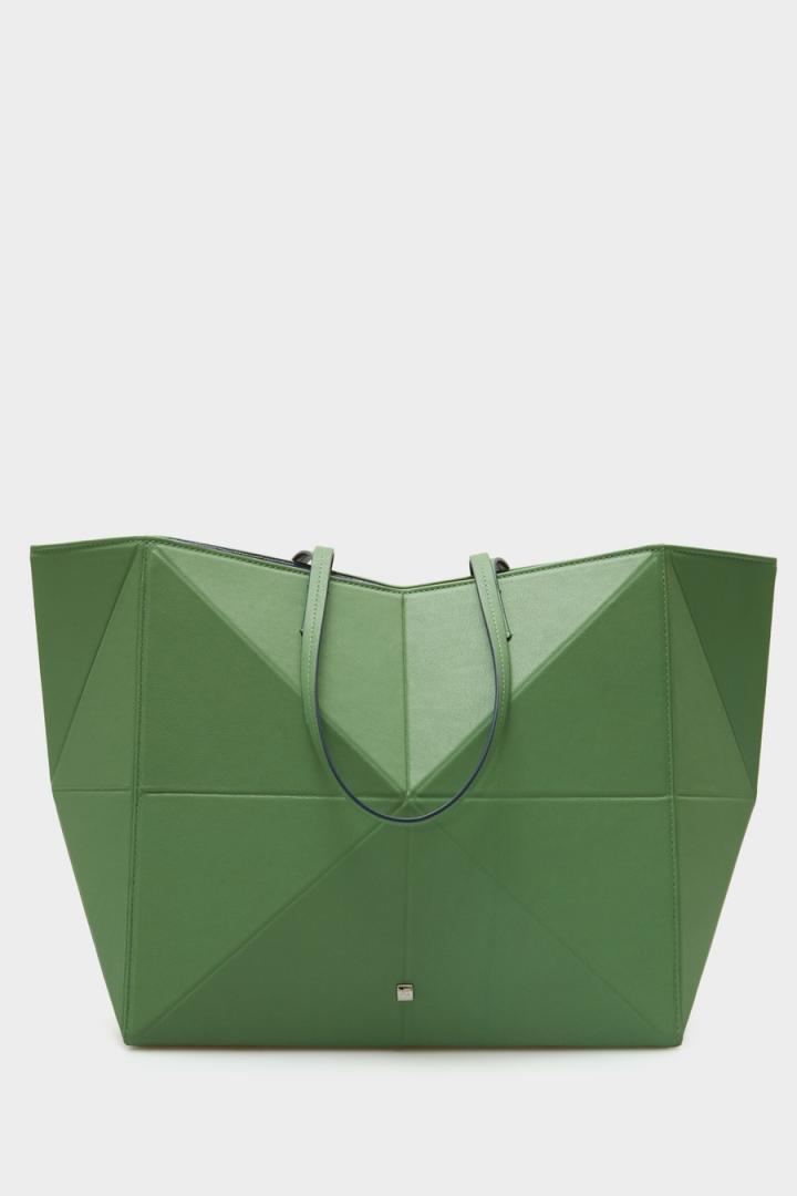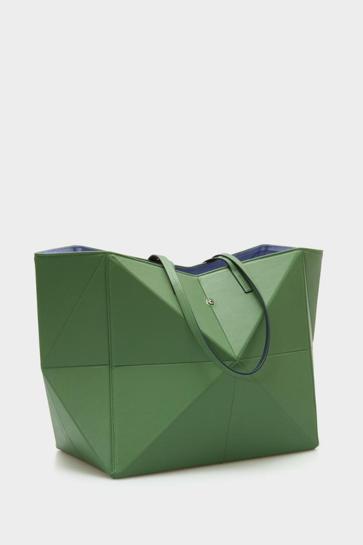 Bolso shopping en piel con grabado Stamp Origami y logo PG y logo cubo metálicos. Doble asa de hombro e interior con forro completo en algodón con un pouch extraíble a contraste.