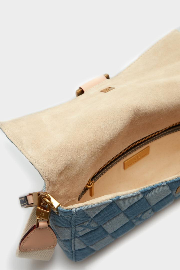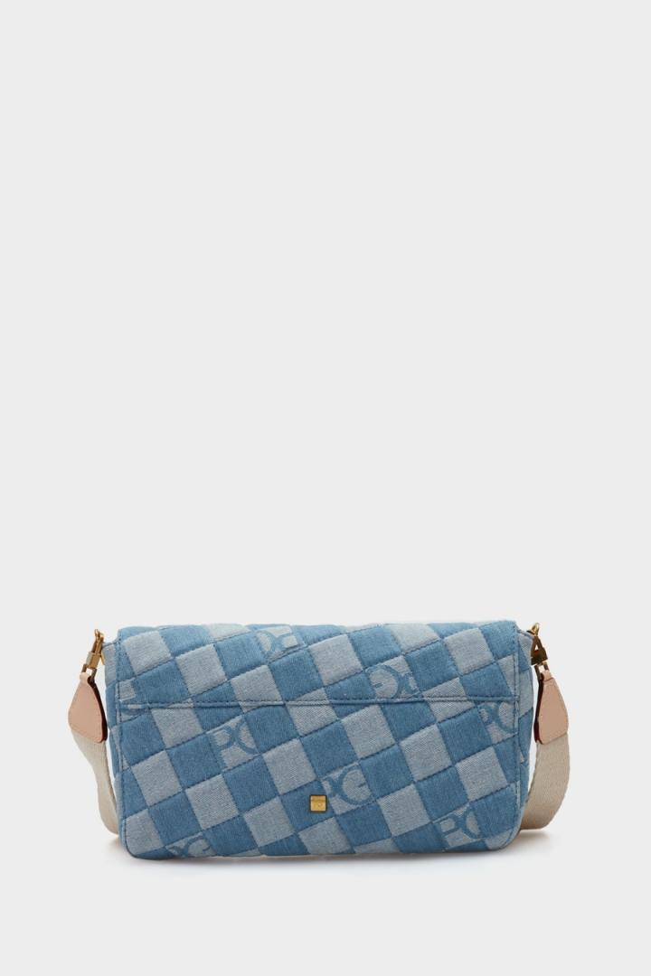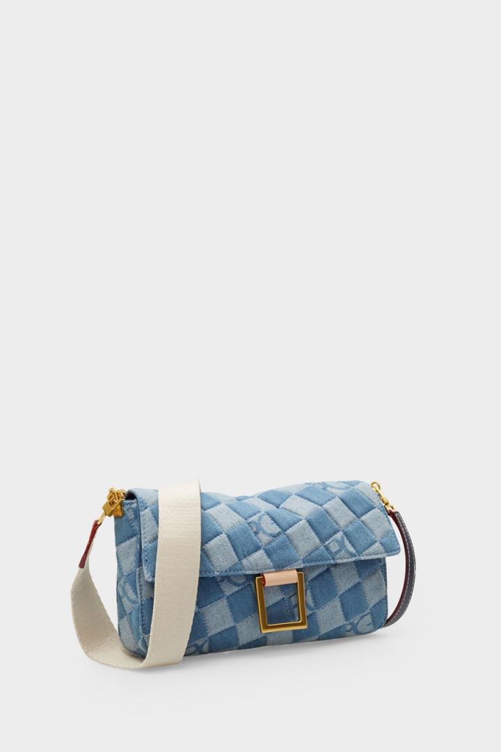 Bolso de hombro en canvas de algodón con jacquard Lona Cubos Denim. Asa de mano en piel y asa de hombro de grosgrain, ambas extraíbles. Solapa personalizada con cierre de metálica en forma de cubo. Interior con forro completo de algodón y un bolsillo con cierre de cremallera.