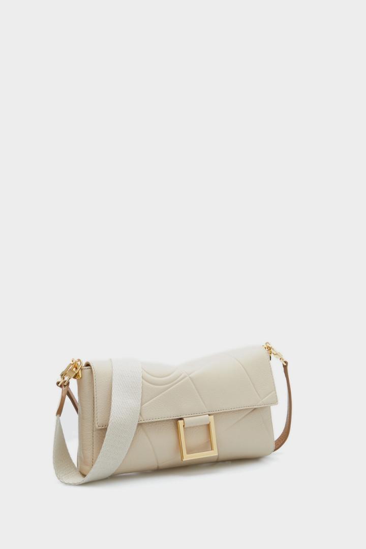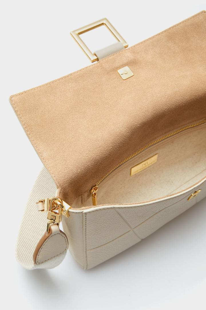 Bolso de hombro en piel con grabado Stamp de cubos y logos PG. Asas de mano de piel y asa de hombro de grosgrain, ambas extraíbles. Solapa personalizada con cierre de metálica en forma de cubo. Interior con forro completo de algodón y lino y un bolsillo de cremallera.