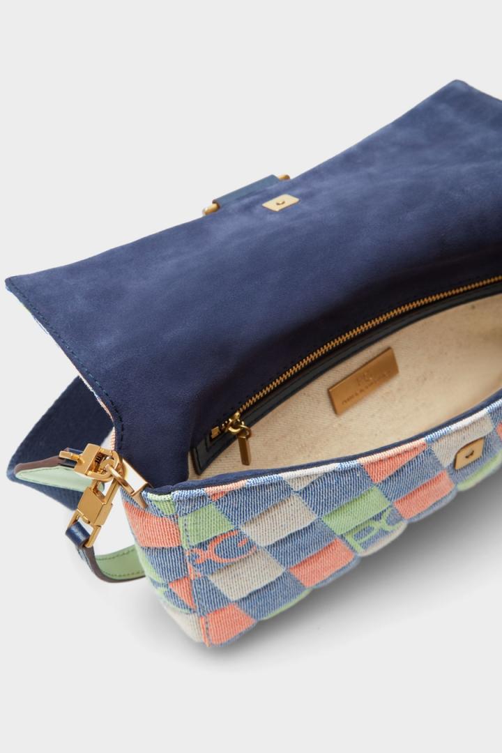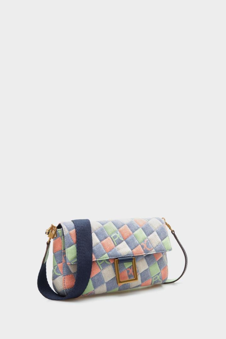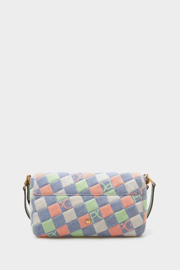 Bolso de hombro pequeño en tejido mezcla de algodón con diseño de cubos y logo PG multicolor. Asa de hombro en grosgrain a contraste y asa de mano en piel bicolor, ambas extraíbles. Solapa con interior en ante y cierre de broche magnético con detalle de metálica en forma de cubo troquelado. Interior con forro completo en algodón y bolsillo de cremallera. Cubo metálico con logo PG grabado en la parte posterior.