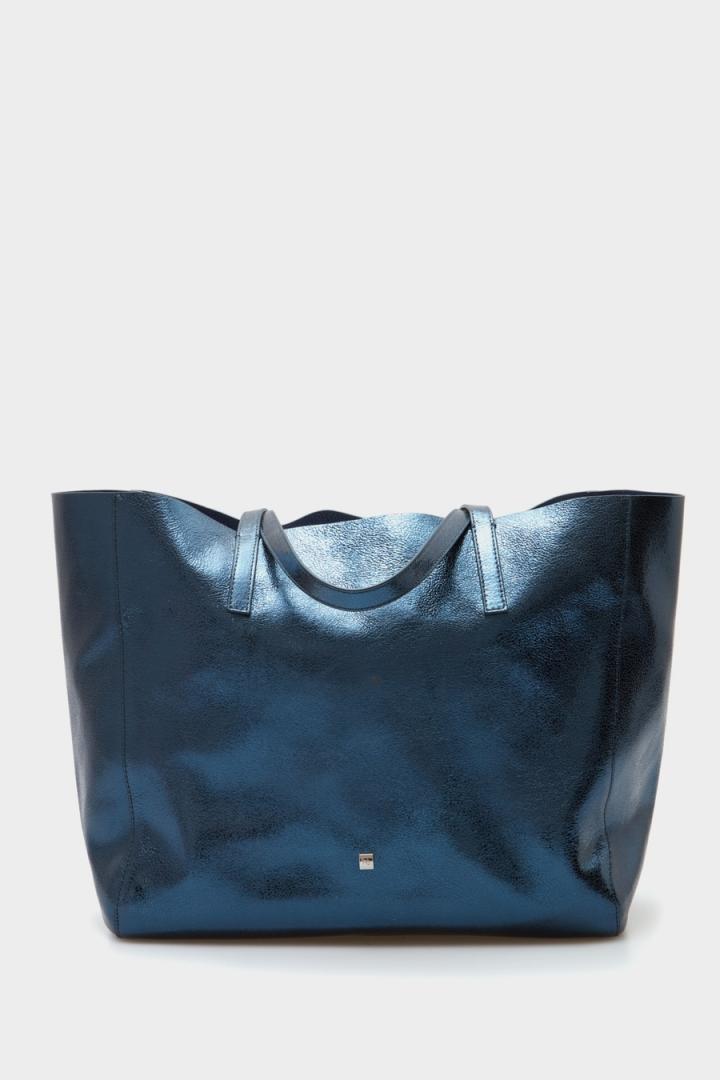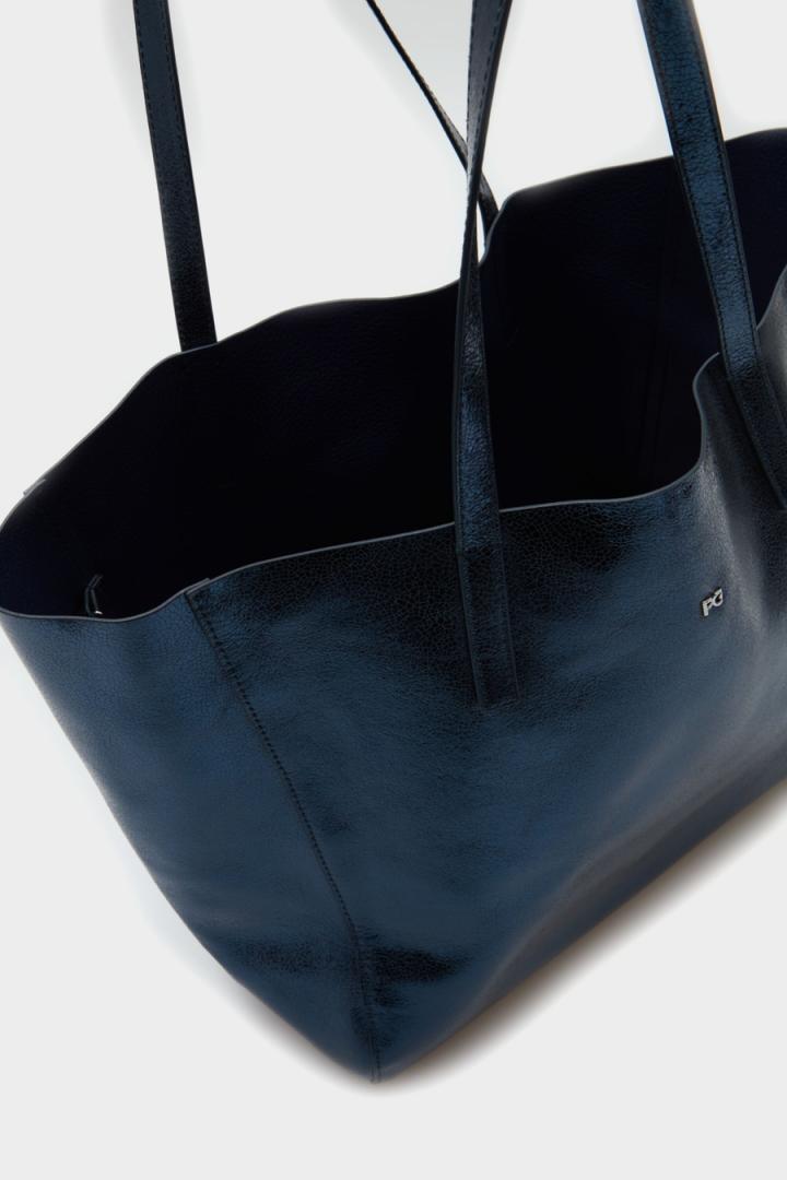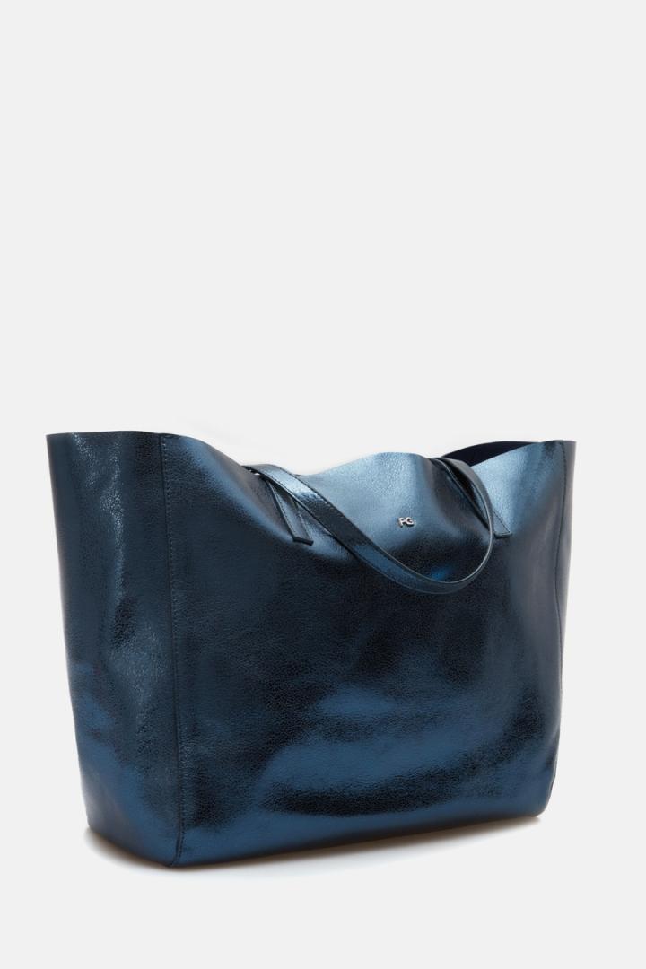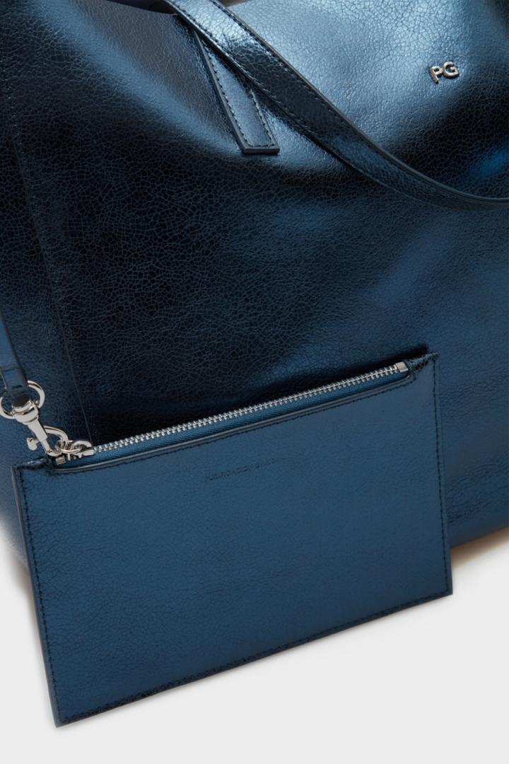 Bolso de hombro grande en piel metalizada. Doble asa de hombro con lujados a tono, interior con acabado natural y pouch interior en piel a tono. Detalle de logo PG metálico en el delantero y cubo metálico con logo PG grabado en la parte posterior.