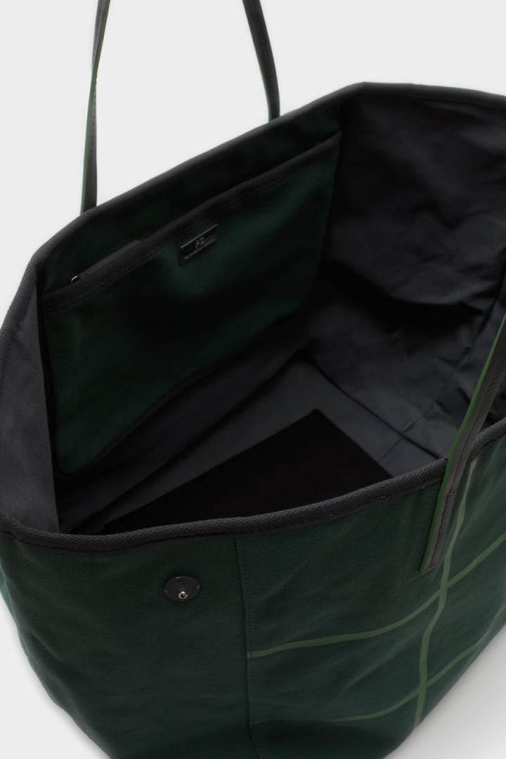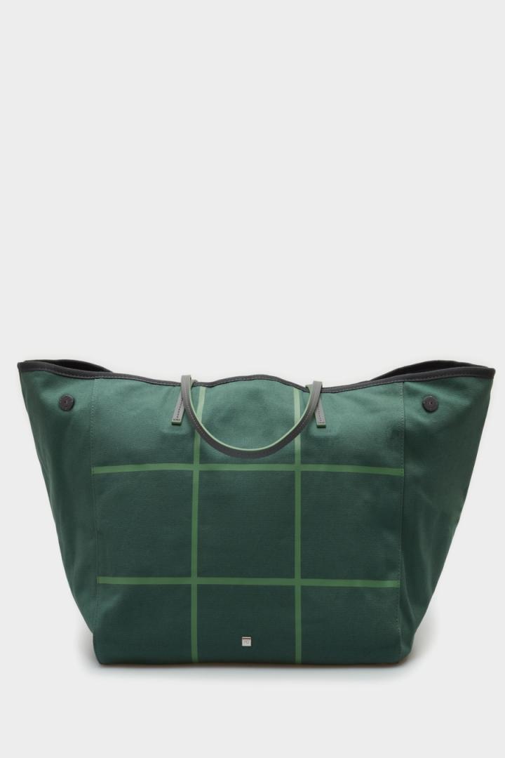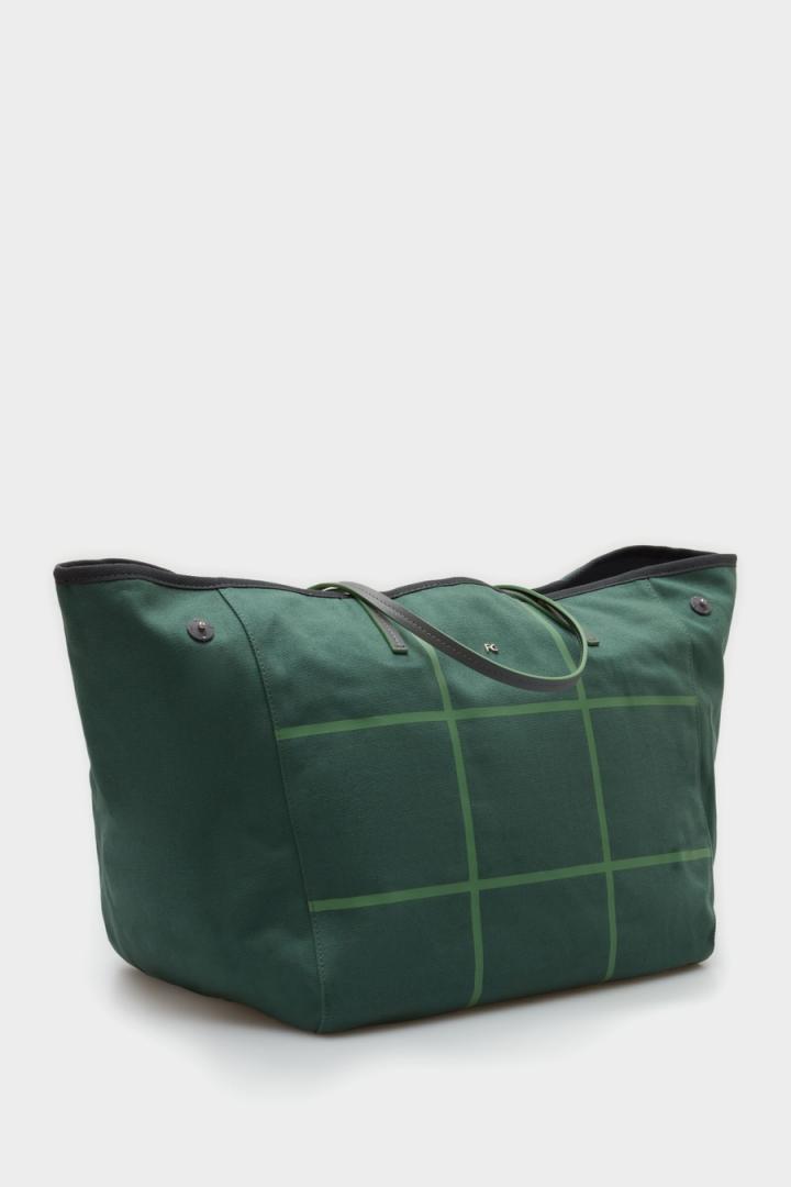 Bolso shopping grande en lona de algodón con estampado de cubos. Doble asa de piel, broches laterales, forro interior completo en algodón y un bolsillo interior con cierre de cremallera. Logo PG y logo cubo metálico en parte delantera y posterior.