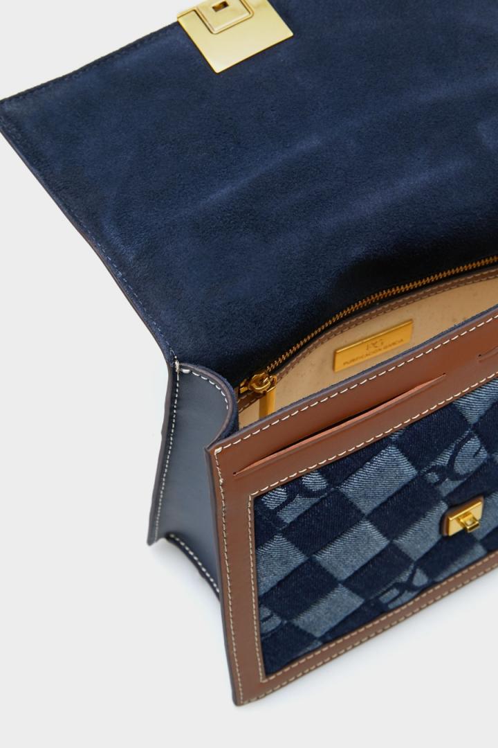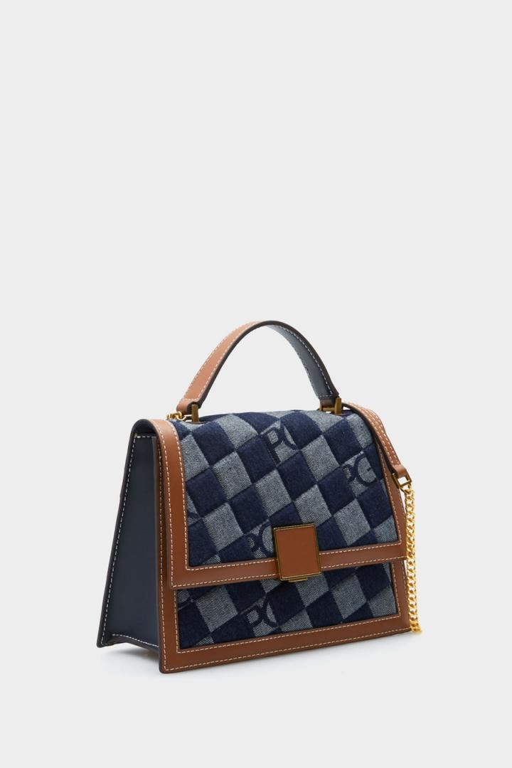 Bolso de mano en canvas de algodón con jacquard de CubosLona Denim y perfiles en piel a contraste. Asa de hombro de cadena con hombrera en piel a tono. Cierre de solapa con metálica en forma de cubo PG. Interior con forro completo de algodón y lino y un bolsillo con cremallera.