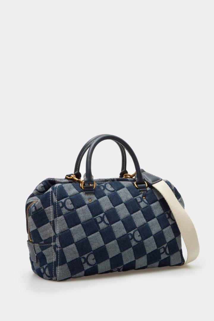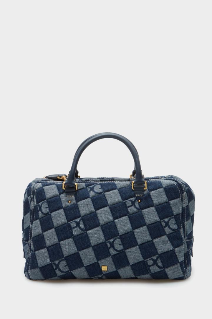 Bolso de mano mediano en lona de algodón con diseño Lona Cubos Denim. Doble asa de mano en piel y asa de hombro extraíble y regulable en grosgrain. Cierre de cr…
