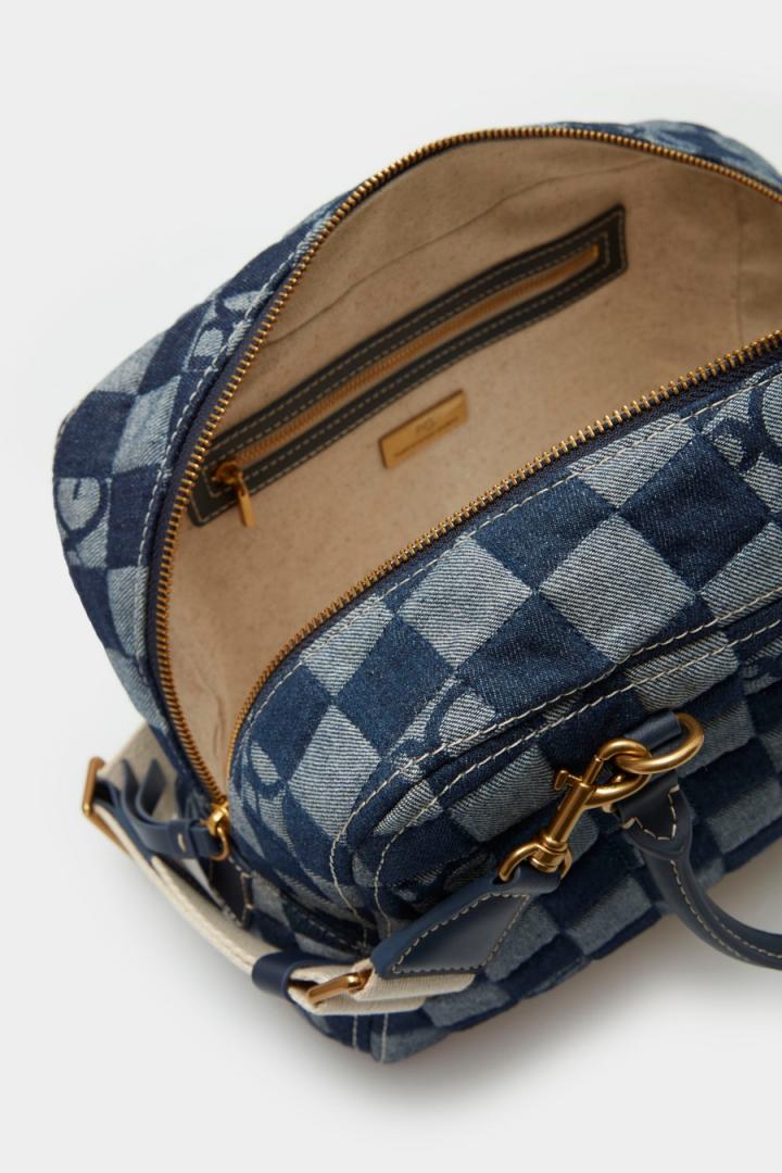 Bolso de mano mediano en lona de algodón con diseño Lona Cubos Denim. Doble asa de mano en piel y asa de hombro extraíble y regulable en grosgrain. Cierre de cremallera. Interior con forro completo de algodón y lino y un bolsillo de cremallera.