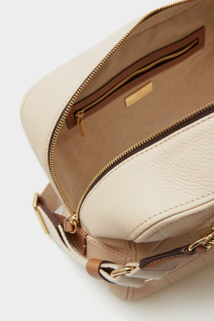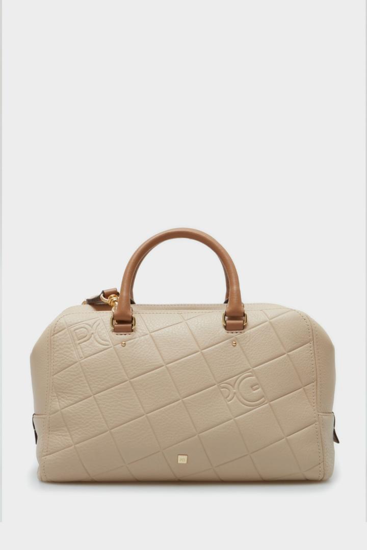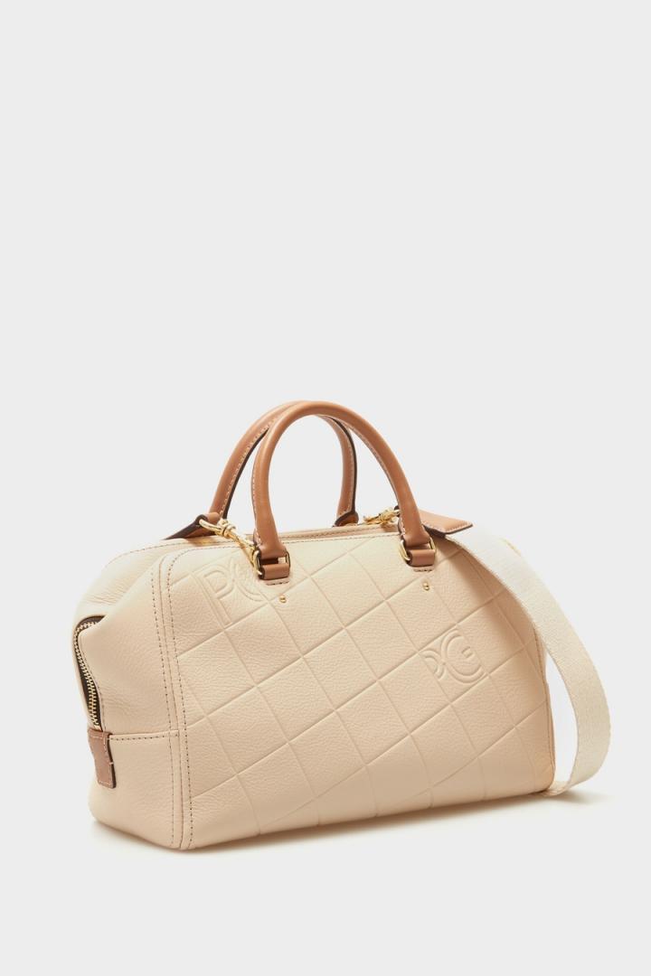 Bolso de mano en piel con el grabado Stamp de cubos y logos PG. Doble asa de mano en vaqueta y asa de hombro extraíble y regulable en grosgrain. Cierre de cremallera. Interior con forro completo de lino y algodón y un bolsillo de cremallera.