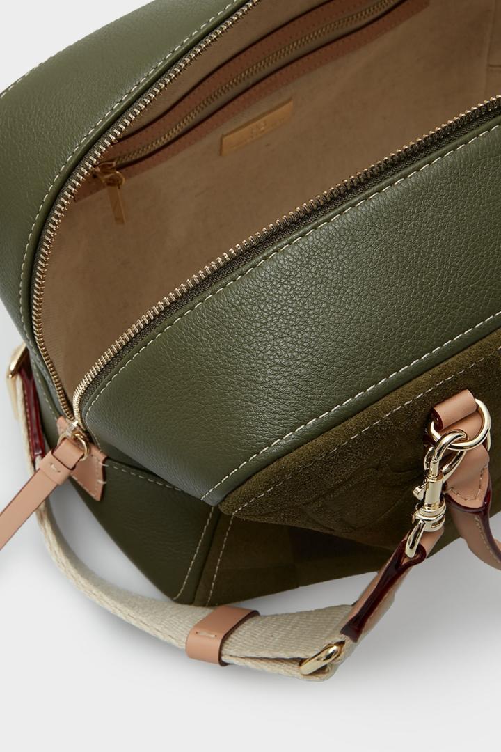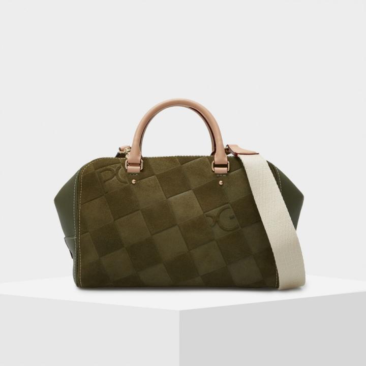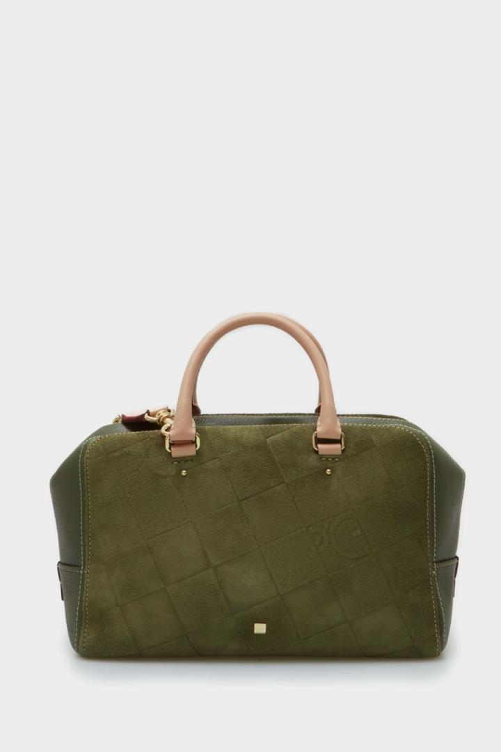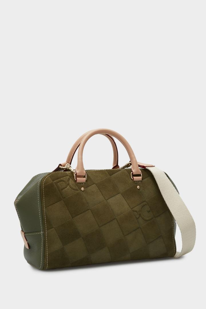 Bolso de mano en ante grabado con Stamp Cubos PG y laterales en piel a tono. Doble asa de mano en vaqueta y asa de hombro extraíble y regulable en grosgrain. Cierre de cremallera. Interior con forro de lino y algodón y un bolsillo de cremallera.