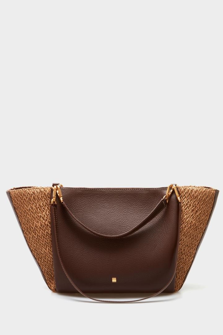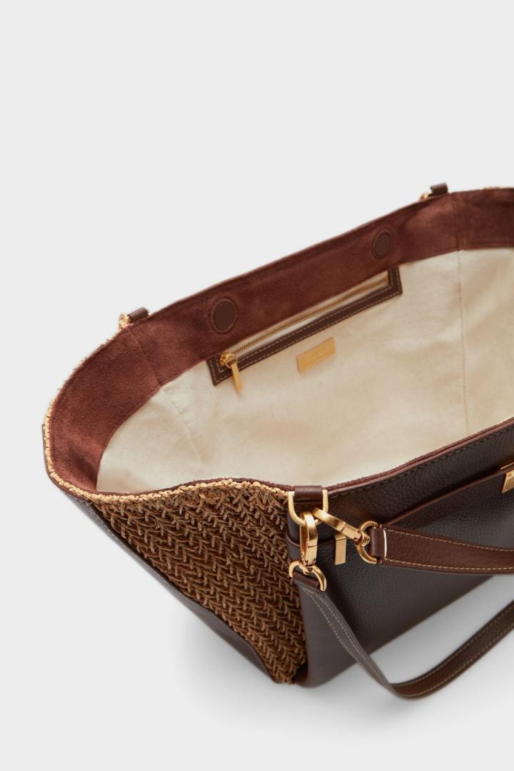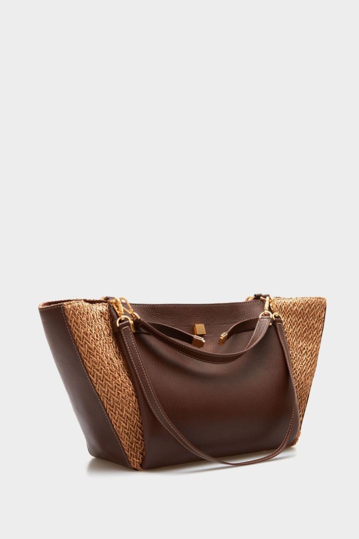 Bolso de mano grande en piel con laterales en fibra de papel trenzada y detalle de tira de piel y placa metálica con cubo en el delantero. Doble asa de mano de piel y asa de hombro de piel, todas extraíbles con mosquetones. Cierre de imán oculto e interior con forro completo de algodón y lino con un bolsillo de cremallera. Detalle de pespuntes a contraste y cubo metálico con logo PG grabado en la parte posterior.