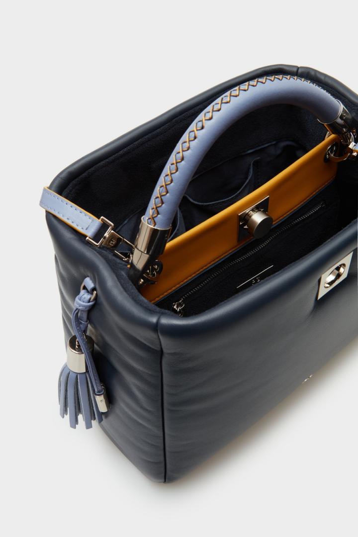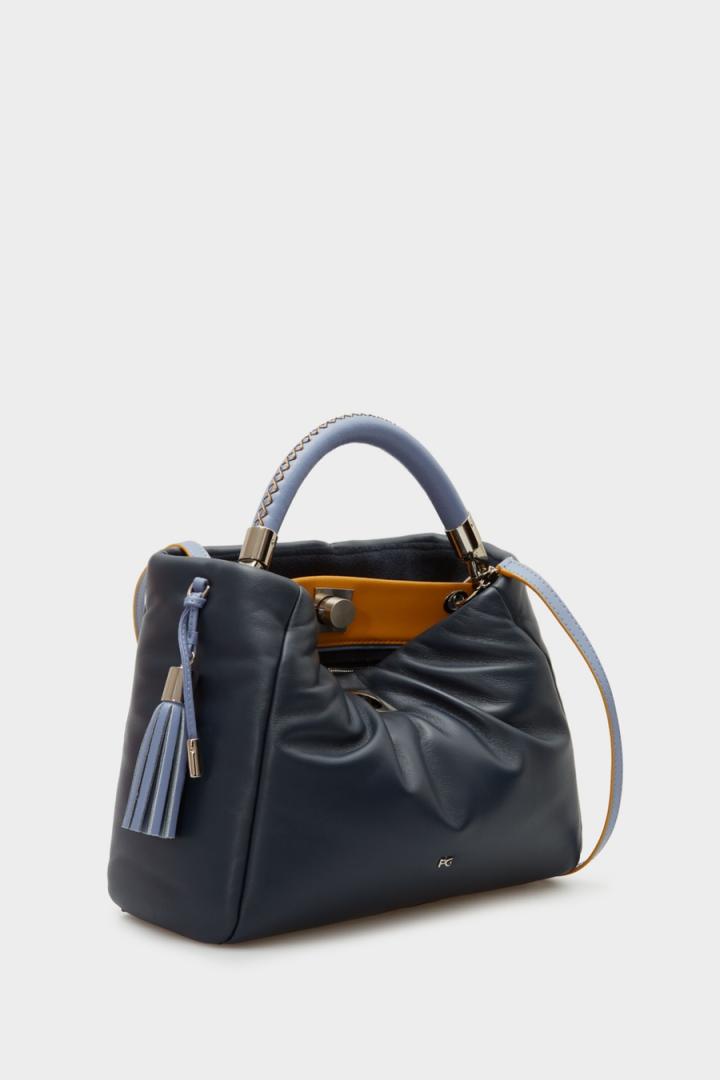 Bolso de mano en piel con detalle de borla de piel a contraste. Asa de mano extraíble y asa bandolera extraíble y regulable a contraste, ambas en piel. Cierre de pulsador e interior con forro completo de algodón dividido en dos compartimentos. Bolsillo interior con cierre de cremallera y dos bolsillos tipo tarjetero.