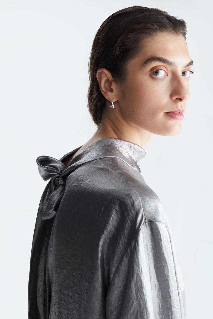 Camisa de línea oversize en tejido técnico con acabado metalizado. Cuello tira con lazada en la espalda y manga francesa ancha. Tiene pantalón a conjunto. La modelo mide 177 cm y lleva una talla S.