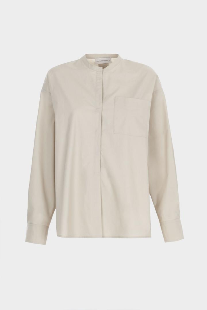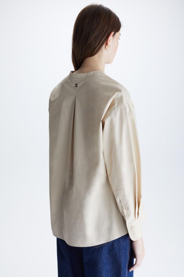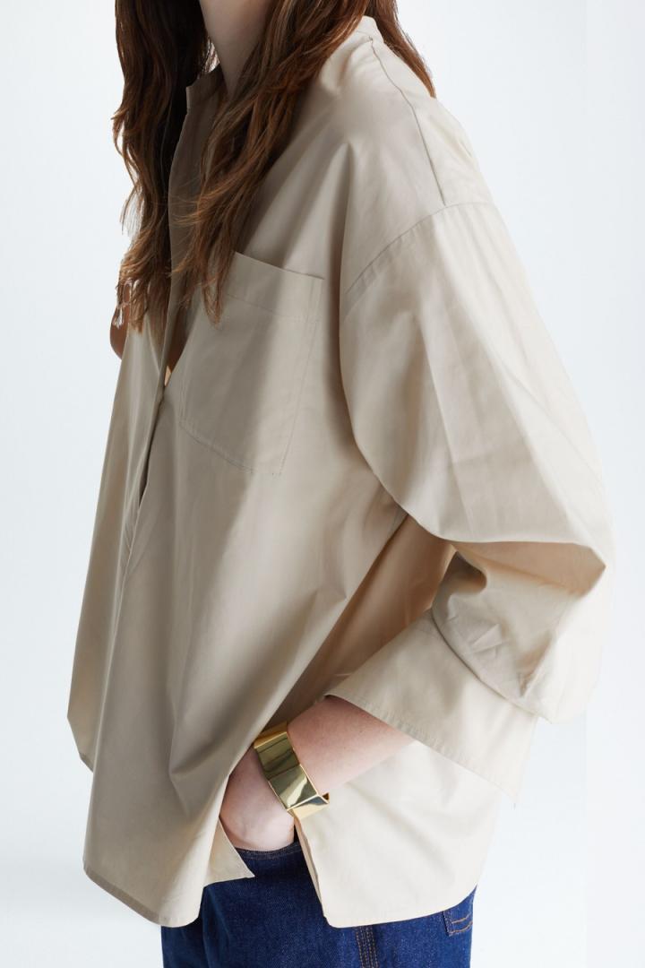 Camisa de línea oversize en popelín de algodón con bolsillo parche en el pecho. Cuello mao, hombro caído, cierre de tapeta con botones ocultos hasta debajo del pecho y manga larga ancha con puños…