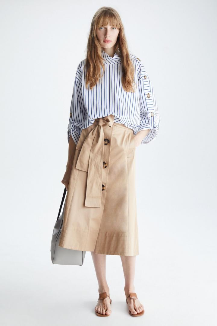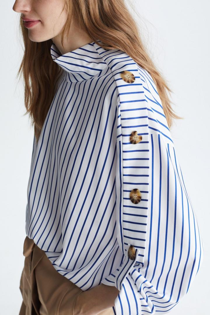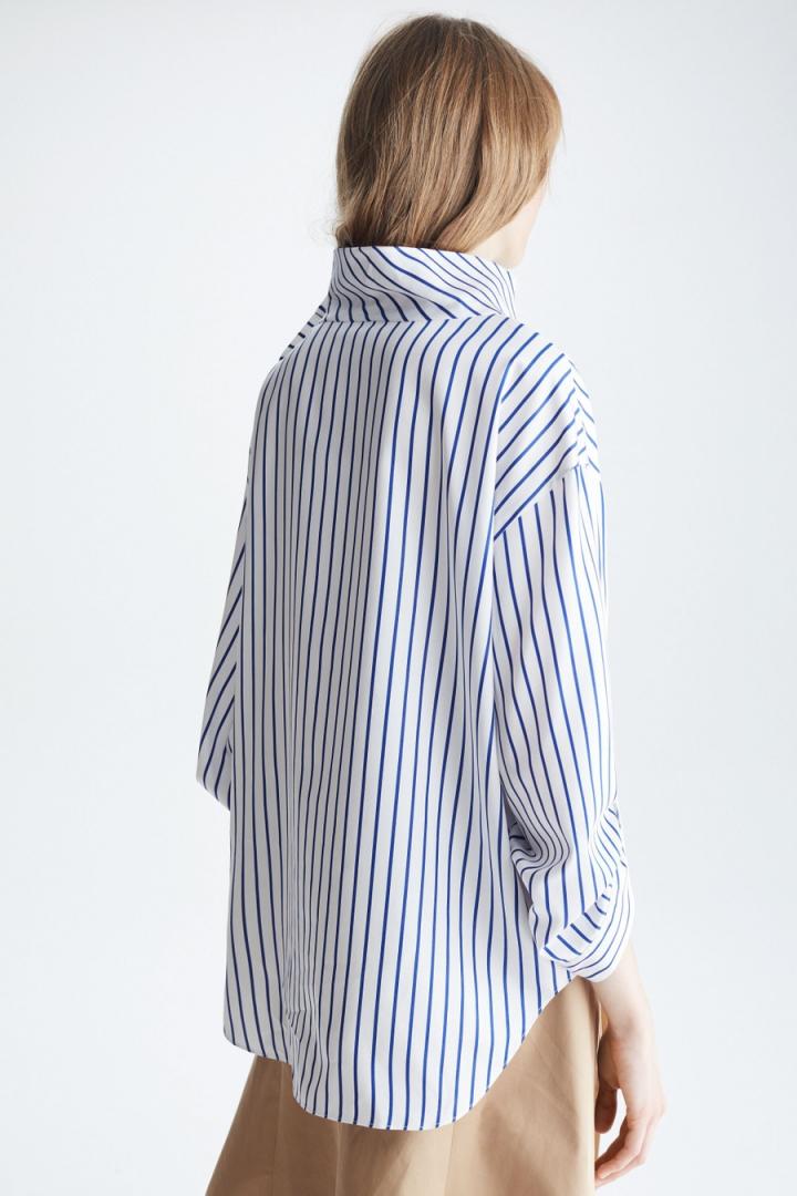 Camisa de línea oversize en satén mezcla de algodón y liocel con diseño de rayas y abertura en hombro izquierdo con botones. Cuello chimenea, hombro caído y manga larga con trabilla y botón para recoger el puño. Bajo redondeado. La modelo mide 178 cm y lleva una talla S.