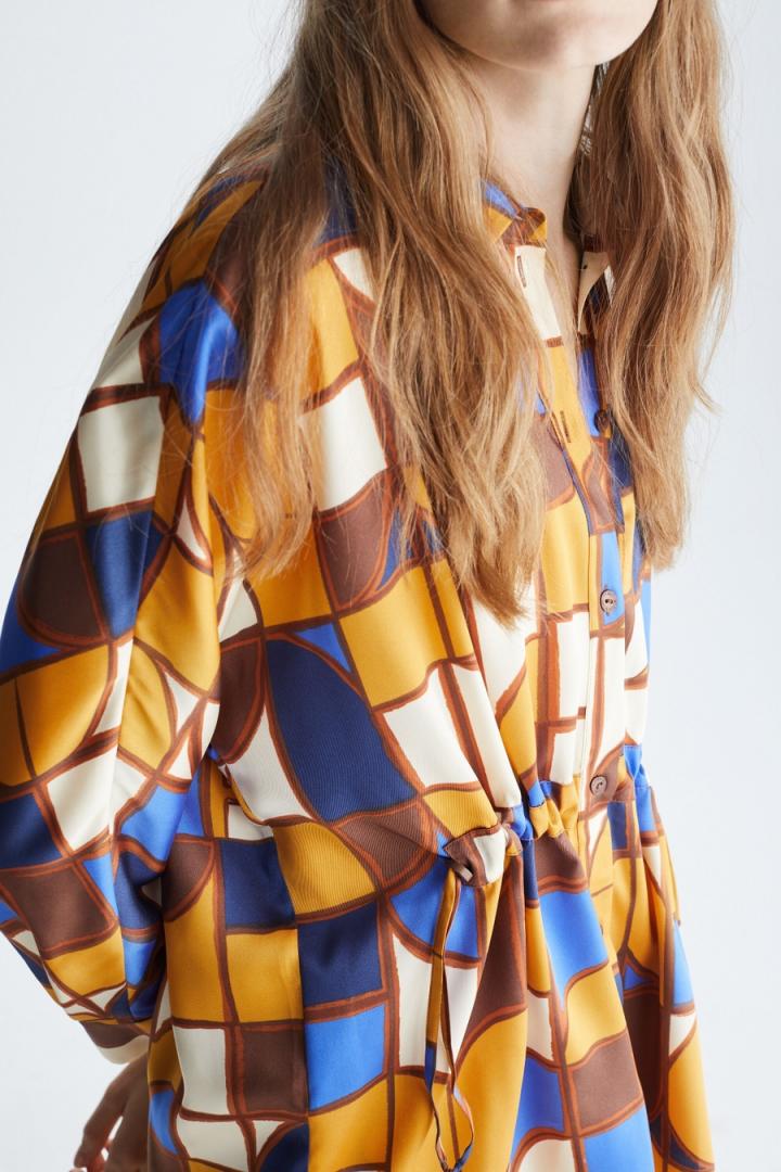 Camisa de línea oversize en twill con estampado Bauhaus multicolor. Cuello camisero, cierre de botones y cintura fruncida con cordón elástico. Tiene falda a conjunto. La modelo mide 178 cm y lleva una talla XS.