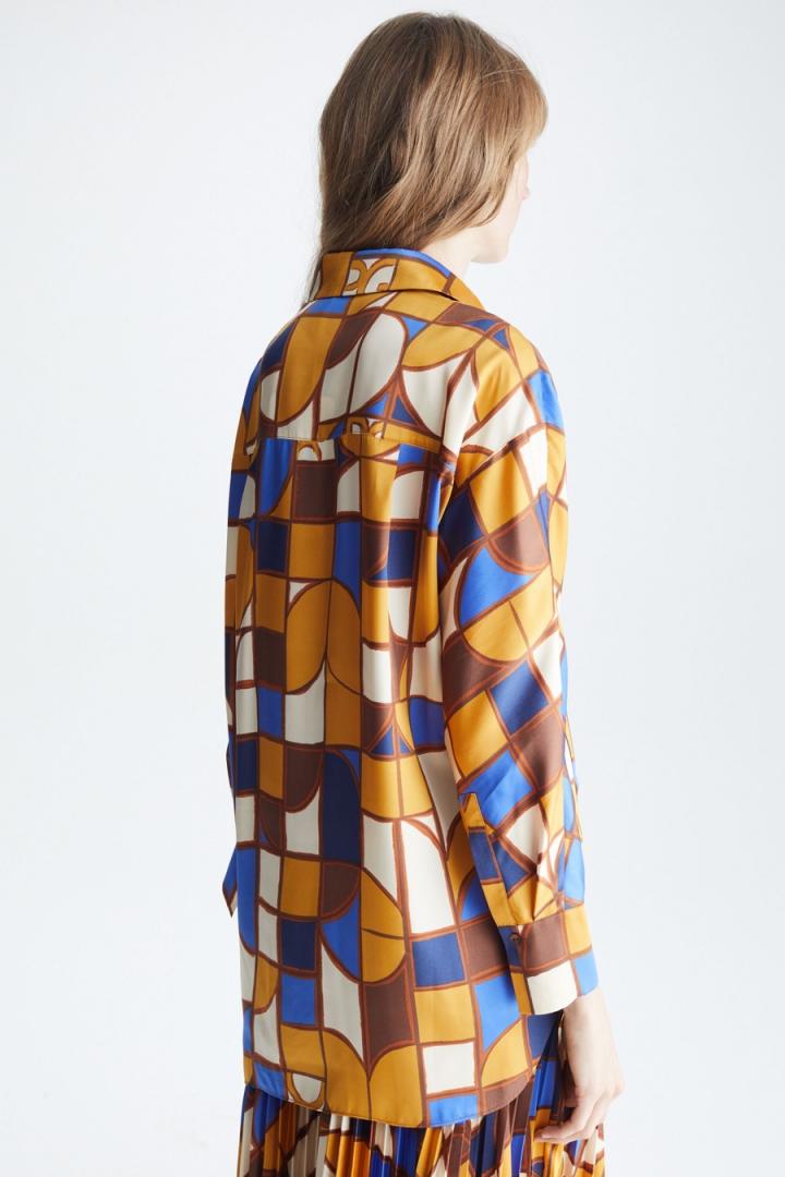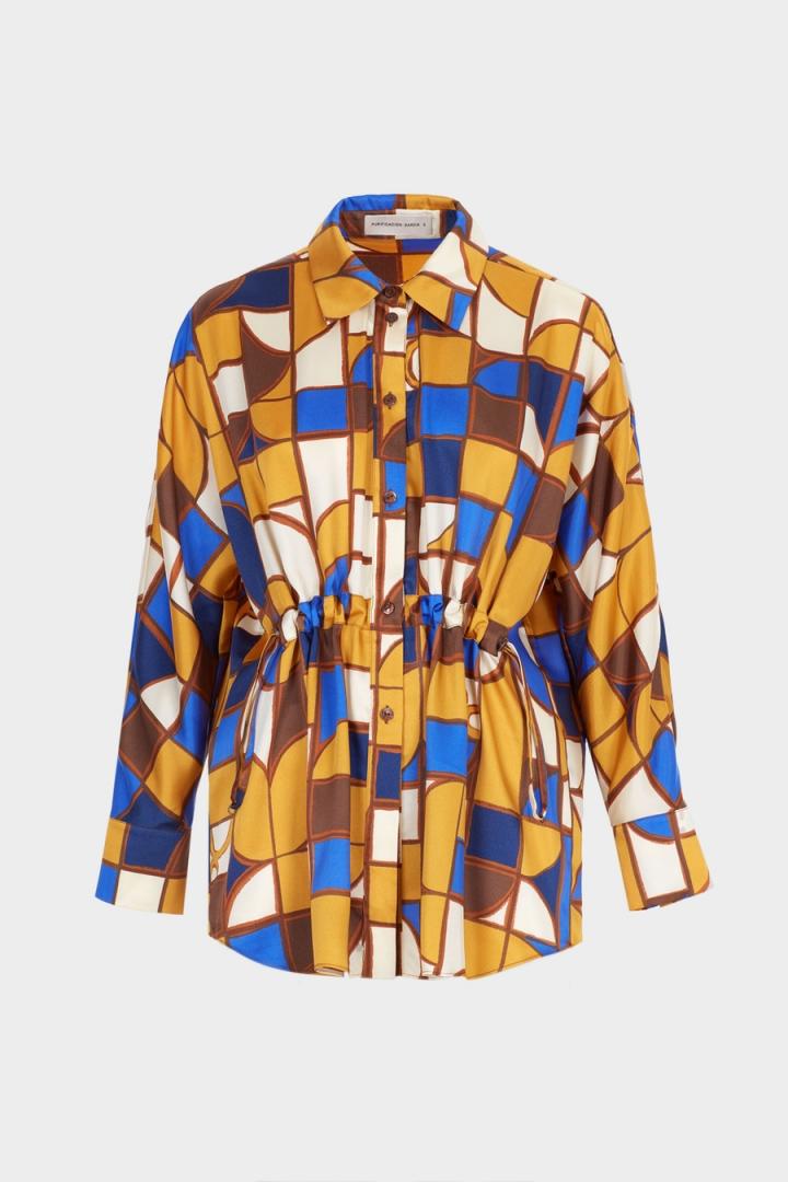 Camisa de línea oversize en twill con estampado Bauhaus multicolor. Cuello camisero, cierre de botones y cintura fruncida con co…