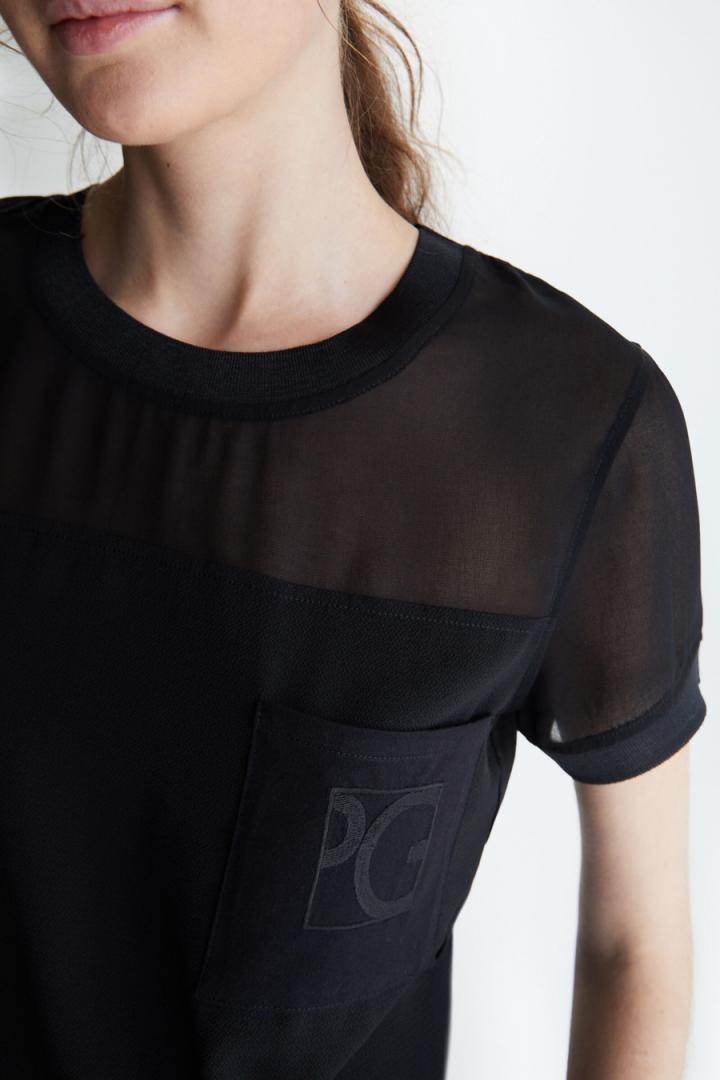 Camiseta de línea recta en jersey de algodón con frontal superior y mangas en chiffon semitransparente a tono. Cuello redondo, manga corta y bolsillo parche en el pecho con Cubo PG bordado a tono. Cuello y puños acanalados. La modelo mide 178 cm y lleva una talla XS.