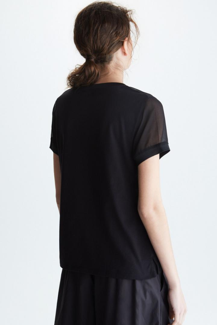 Camiseta de línea recta en jersey de algodón con frontal superior y mangas en chiffon semitransparente a tono. Cuello redondo, manga corta y bolsillo …