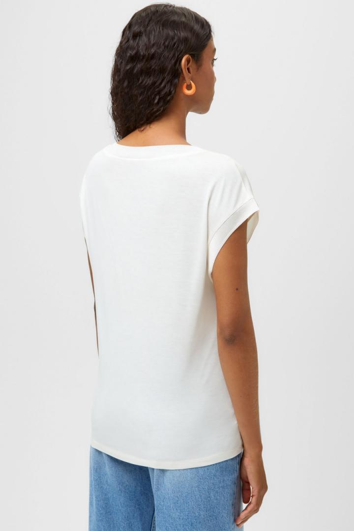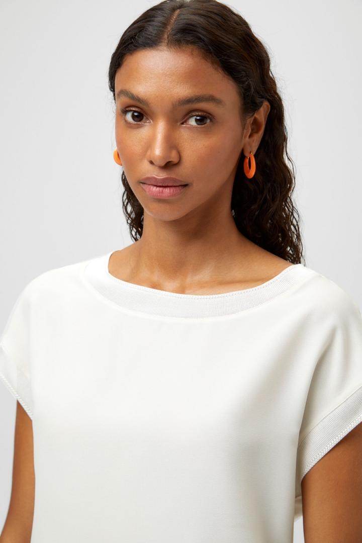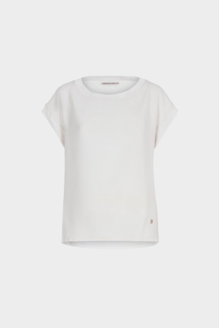 Camiseta de línea recta en crepé georgette. Cuello redondo y manga corta. Detalle de placa metálica PG en bajo delantero. La modelo mide 174 cm y lleva una talla S.