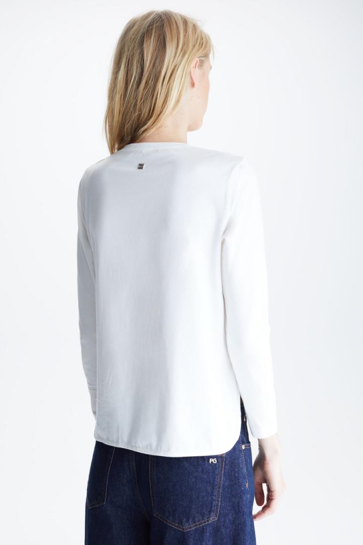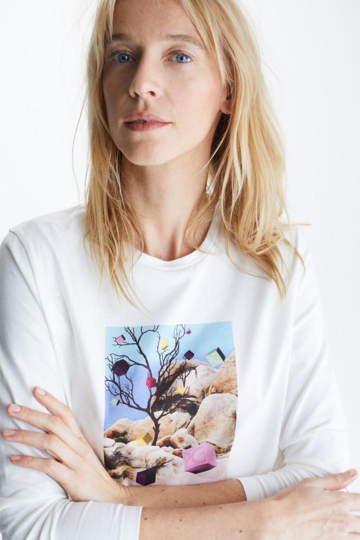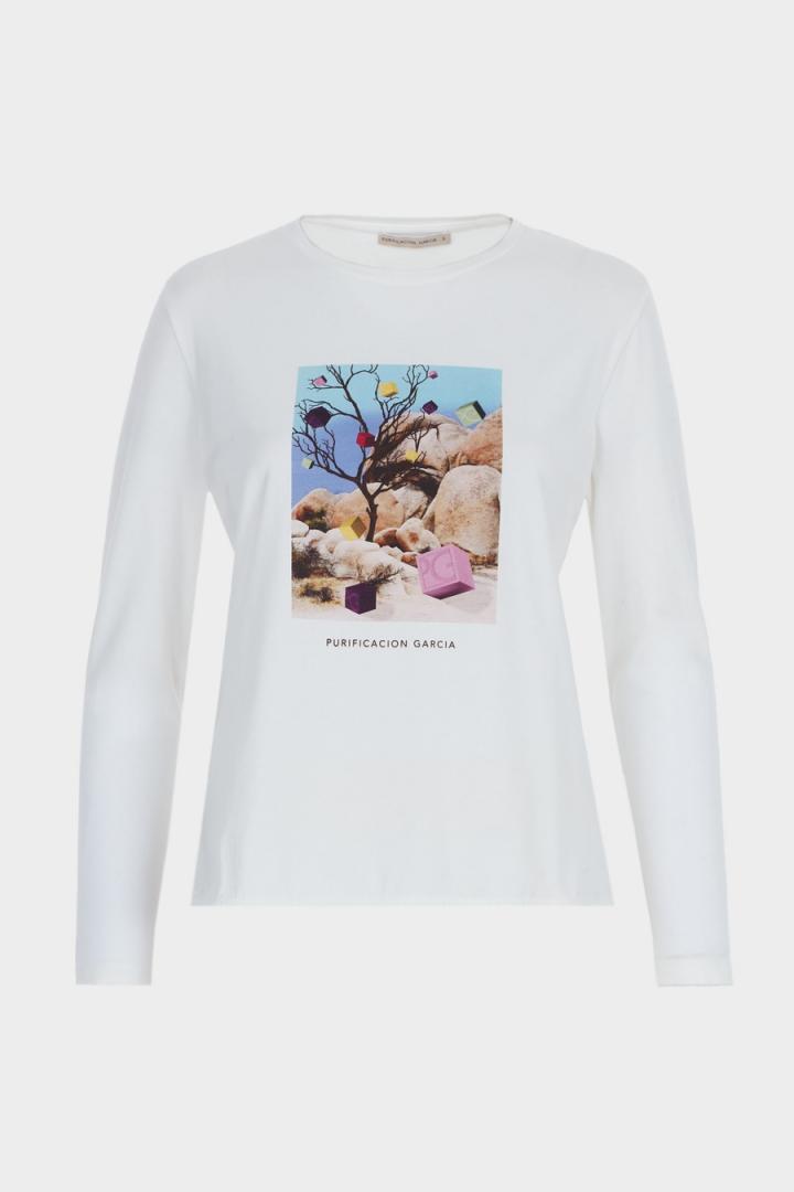Camiseta de línea recta en algodón stretch con estampado fotográfico de Cubos PG y logo Purificacion Garcia en el delantero. Cuello redondo, manga larga, aberturas laterales redondeadas y detalle de cubo metálico con logo PG grabado en la espalda. La modelo mide 180 cm y lleva una talla S.