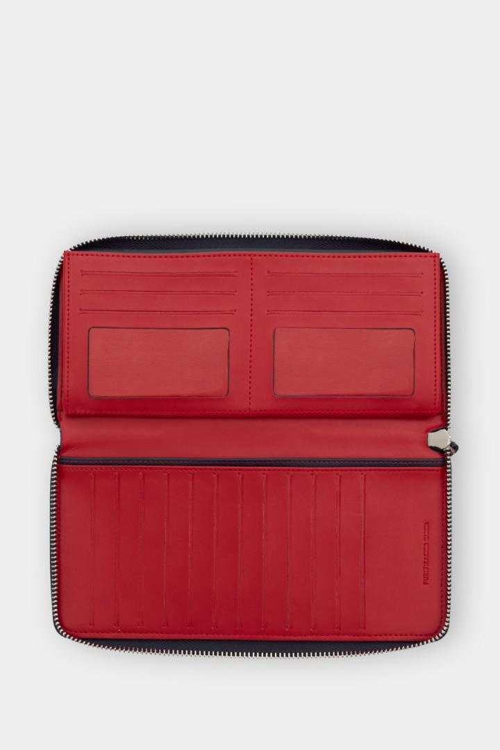 Cartera americana en piel napa acolchada con diseño geométrico Granada. Cierre de cremallera con tirador de piel a tono. Interior a contraste con dos compartimentos para billetes, 18 ranuras para tarjetas y monedero con cremallera.