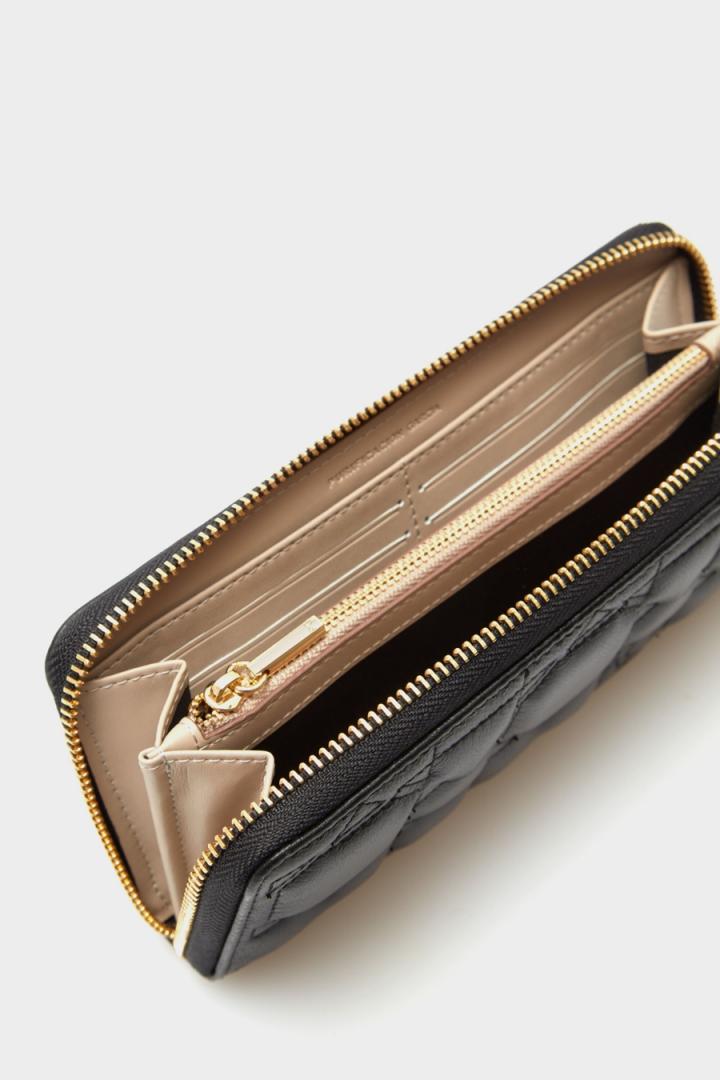 Cartera americana en napa acolchada con diseño geométrico Granada. Cierre de cremallera con tirador en piel a tono. Interior con dos compartimentos para billetes, 12 ranuras para tarjetas y monedero con cremallera.