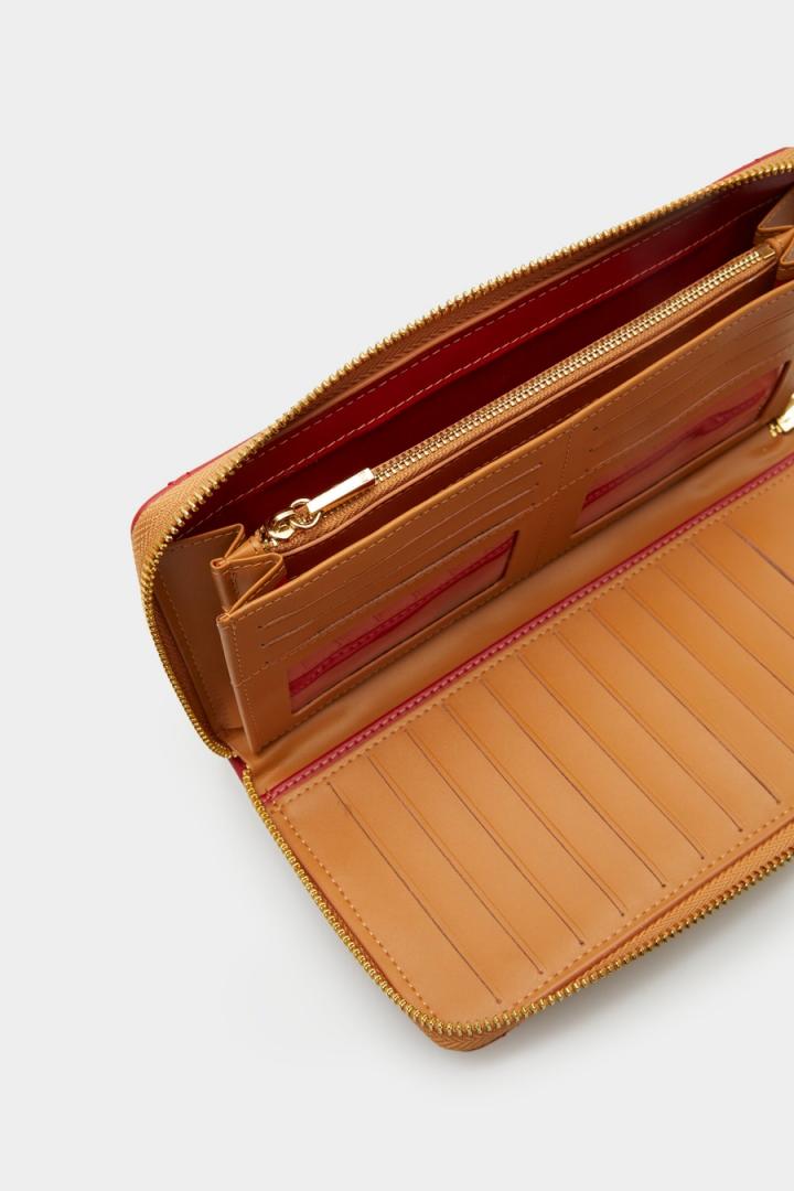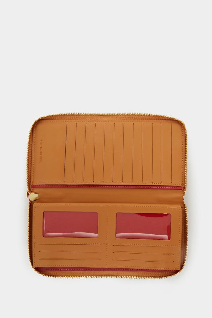 Cartera americana en piel napa acolchada con diseño geométrico Granada. Cierre de cremallera con tirador de piel a tono. Interior a contraste con dos compartimentos para billetes, 18 ranuras para tarjetas y monedero con cremallera.