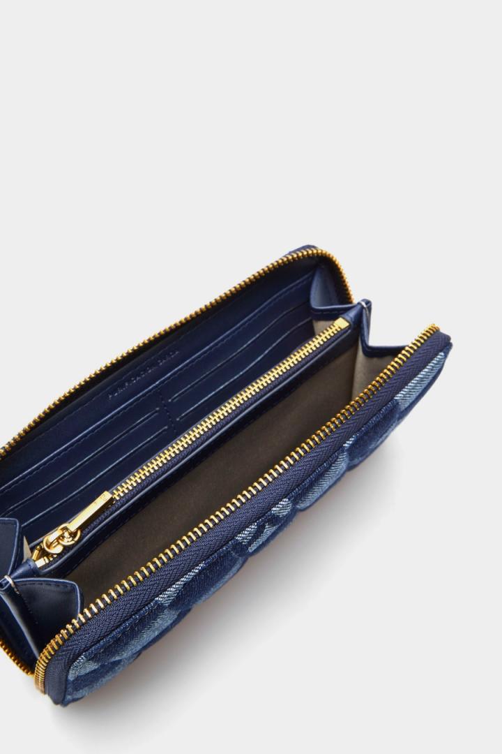 Cartera americana en lona de algodón con diseño de cubos Lona Cube Denim. Cierre de cremallera con tirador de piel a tono. Interior de piel con dos compartimentos para billetes, 12 ranuras para tarjetas y monedero con cremallera.