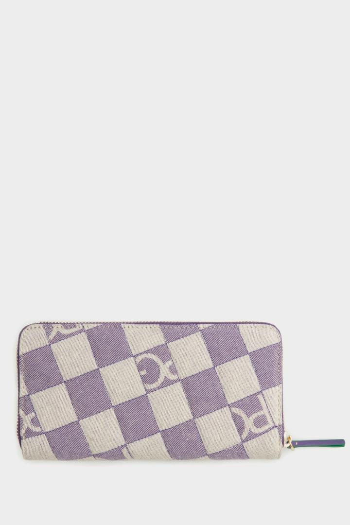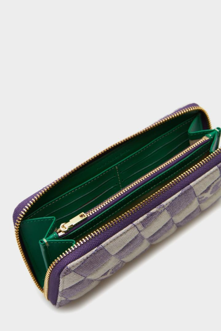 Cartera americana en lona de algodón con diseño de cubos Lona Cubos Denim. Cierre de cremallera con tirador de piel a tono. Interior de piel con dos compartimentos para billetes, 12 ranuras para…
