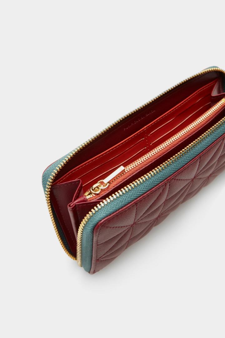 Cartera americana en piel napa acolchada con diseño Origami. Cierre de cremallera con tirador de piel a tono. Interior de piel a contraste con dos compartimentos para billetes, 12 ranuras para tarjetas y monedero con cremallera.