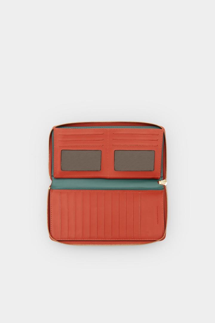 Cartera americana en piel napa acolchada con diseño Origami. Cierre de cremallera con tirador de piel a tono. Interior de piel a contraste con dos compartimentos para billetes, 18 ranuras para tarjetas y monedero con cremallera.