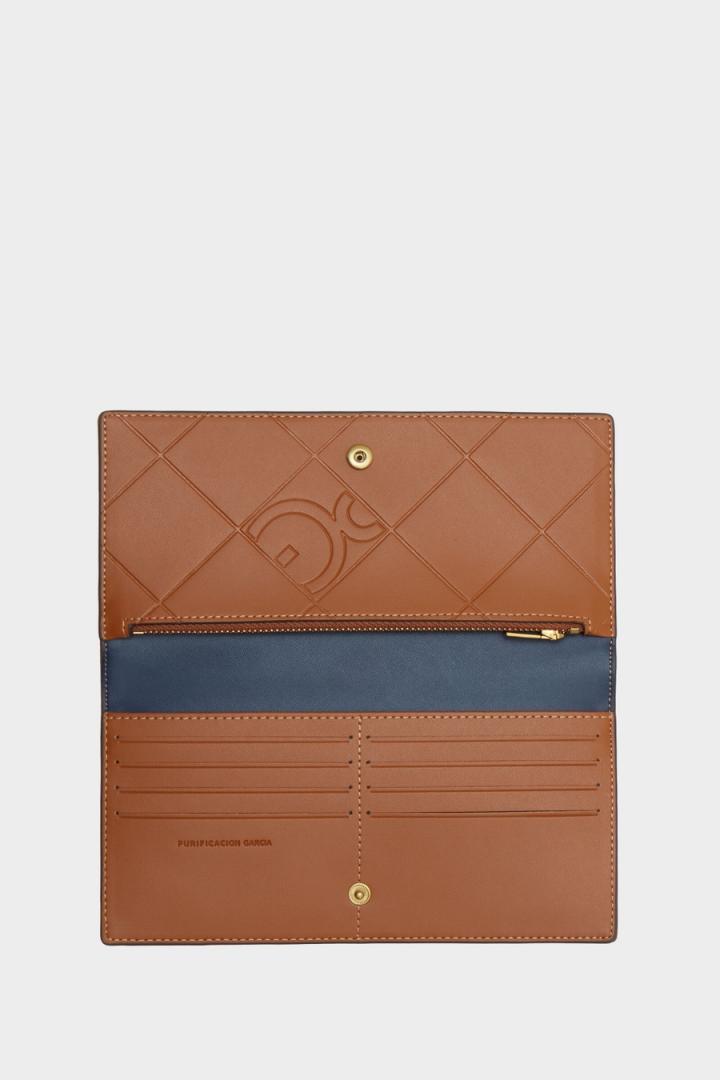 Cartera americana en piel con grabado Stamp de cubos y logo PG y pespuntes a contraste. Cierre de solapa con broche e interior con ocho ranuras para tarjetas, dos compartimentos para billetes y mon…