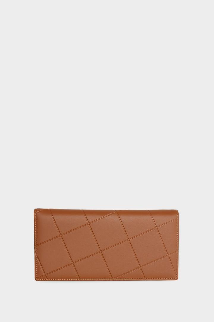 Cartera americana en piel con grabado Stamp de cubos y logo PG y pespuntes a contraste. Cierre de solapa con broche e interior con ocho ranuras para tarjetas, dos compartimentos para billetes y monedero con cierre de cremallera.