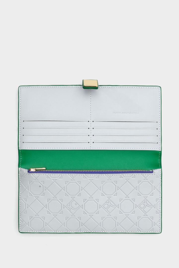 Cartera americana de piel con grabado geométrico Granada y logos PG. Cierre de tira con broche y detalle de cubo metálico. Interior a contraste con monedero, billetera y ocho ranuras para tarjetas….