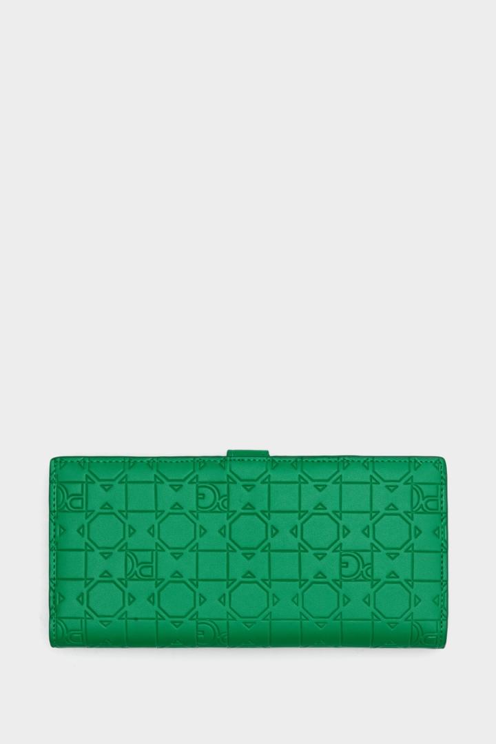 Cartera americana de piel con grabado geométrico Granada y logos PG. Cierre de tira con broche y detalle de cubo metálico. Interior a contraste con monedero, billetera y ocho ranuras para tarjetas.