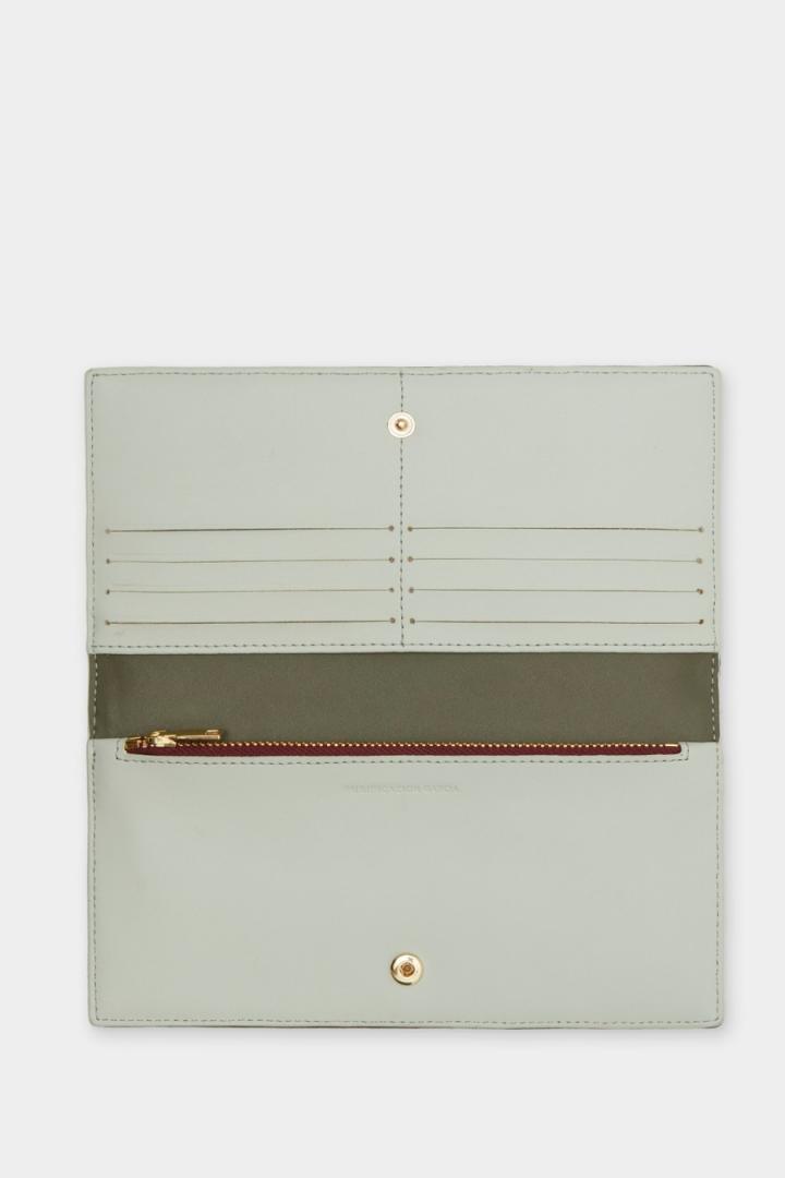 Cartera americana en piel con detalle de cubo PG metálico. Cierre de broche e interior a contraste con monedero, billetera y ocho ranuras para tarjetas….