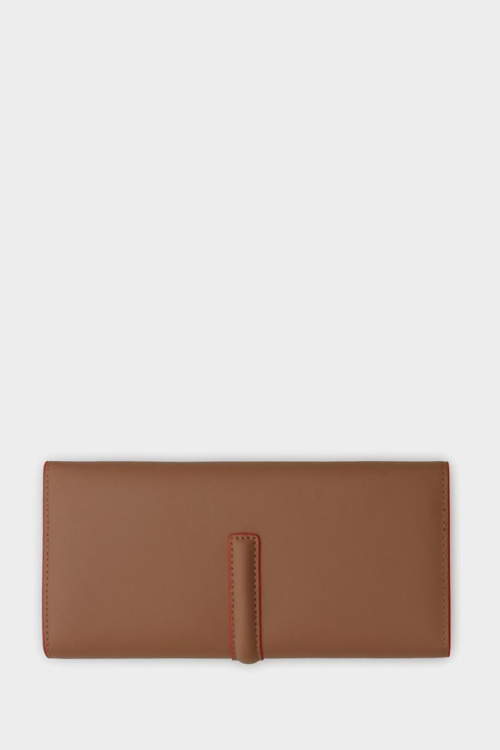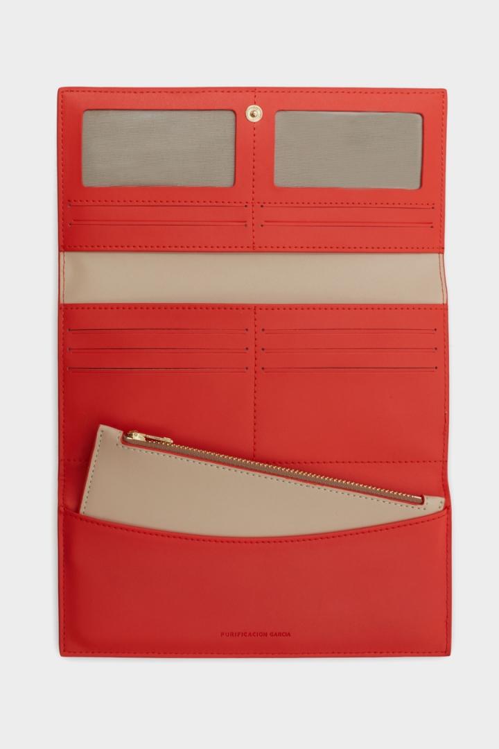 Cartera americana en piel con detalle de candado metálico grabado con logo PG en la solapa. Cierre de solapa con broche e interior a contraste con monedero extraíble, dos compartimentos para billetes y diez ranuras para tarjetas.