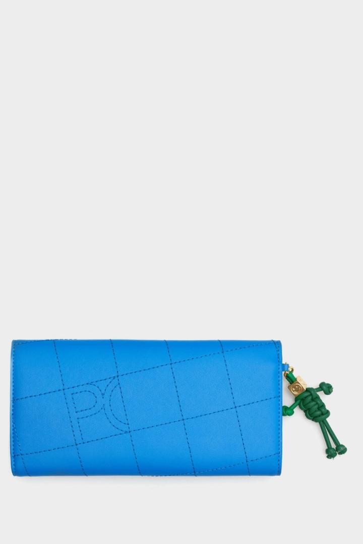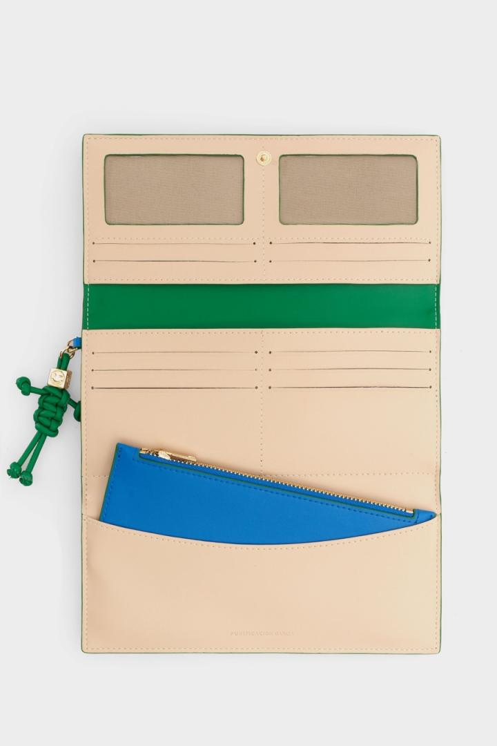 Cartera americana en piel con diseño geométrico y logo PG pespunteado. Cierre de solapa con broche. Interior a contraste con monedero extraíble, dos compartimentos para billetes y diez ranuras para tarjetas. Incluye charm de piel con diseño anudado en forma de Cubi.