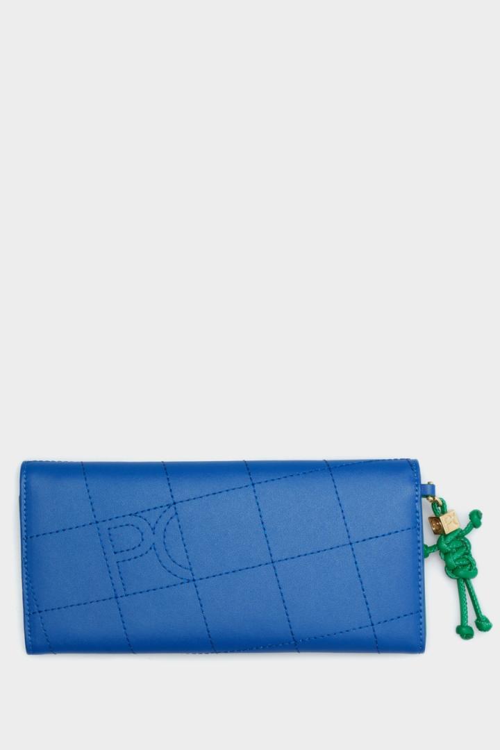 Cartera americana en piel con diseño geométrico de cubos y logo PG pespunteado a tono. Cierre de solapa con broche. Interior a contraste con monedero extraíble, dos compartimentos para billetes y diez ranuras para tarjetas. Incluye charm de piel con diseño anudado en forma de Cubi.