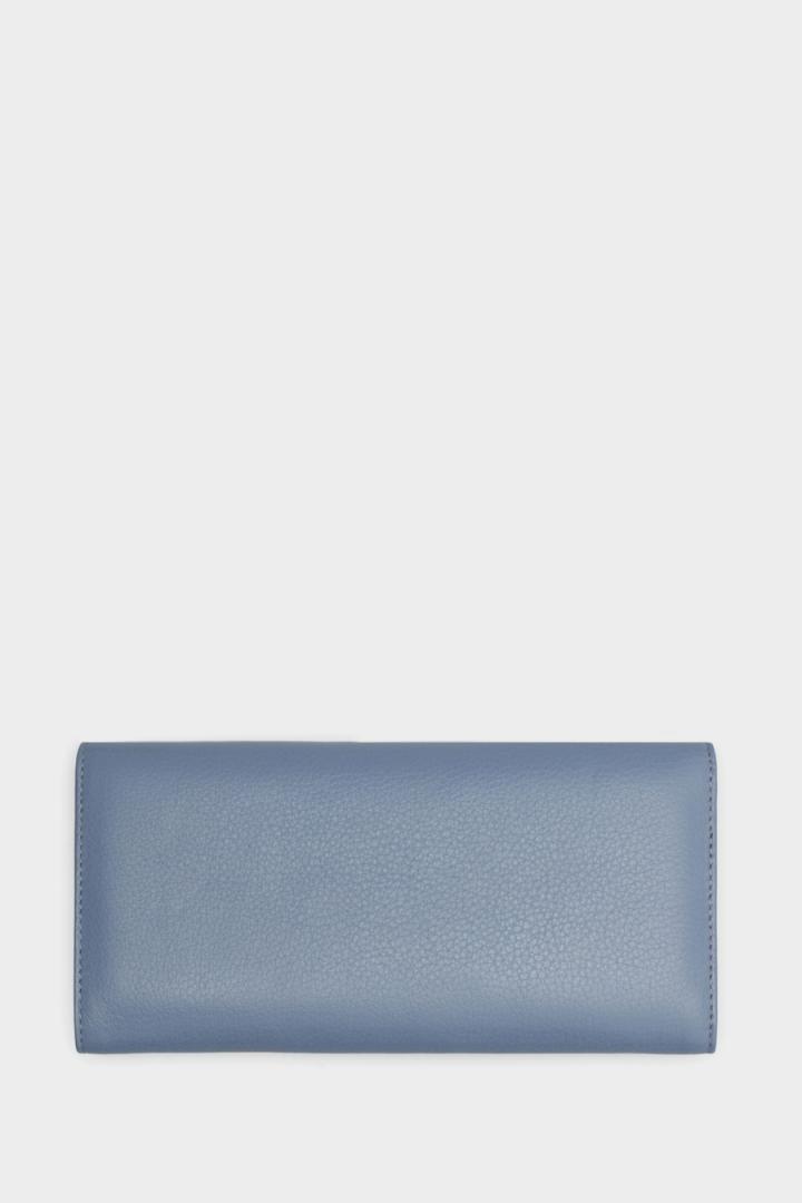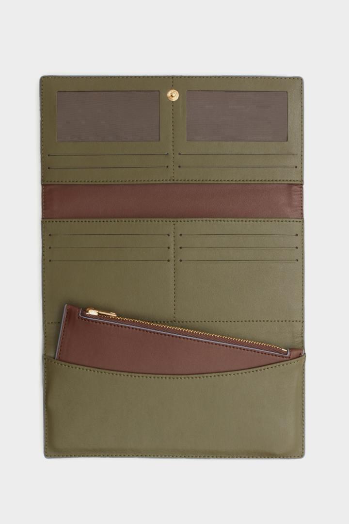 Cartera americana en piel con detalle de tira de piel y placa metálica con cubo en el delantero. Cierre de solapa con broche e interior con monedero extraíble a contraste, dos compartimentos para billetes y diez ranuras para tarjetas.