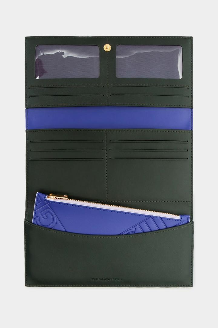 Cartera americana en piel con grabado Stamp de Cinta PG. Cierre de solapa con broche. Interior a contraste con monedero extraíble, dos compartimentos para billetes y diez ranuras para tarjetas.