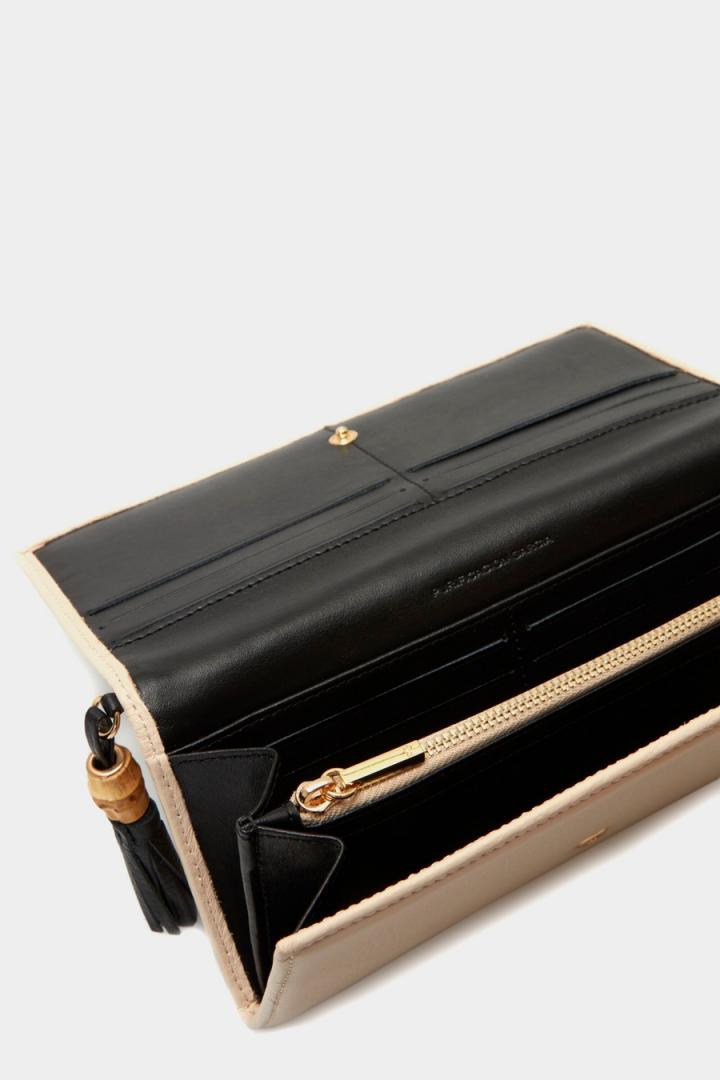 Cartera americana de piel con cierre de solapa y borla de piel con colgante efecto bambú. Detalle de metálicas con logo PG. Interior con monedero, dos compartimentos para billetes y 12 ranuras para tarjetas.