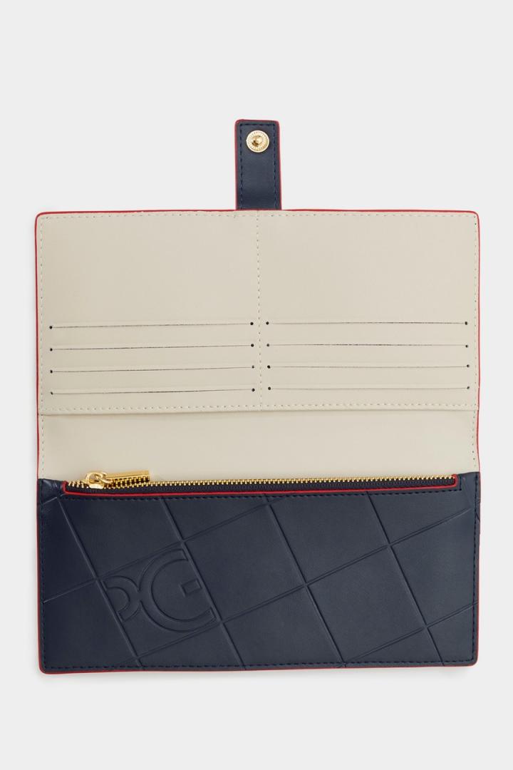 Cartera americana de piel con el grabado Stamp de cubos y logos PG. Cierre de tira con broche y detalle de cubo metálico. Interior con monedero, billetera y 8 ranuras para tarjetas.