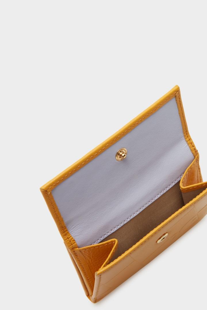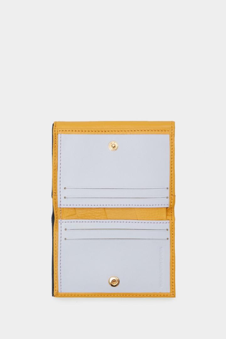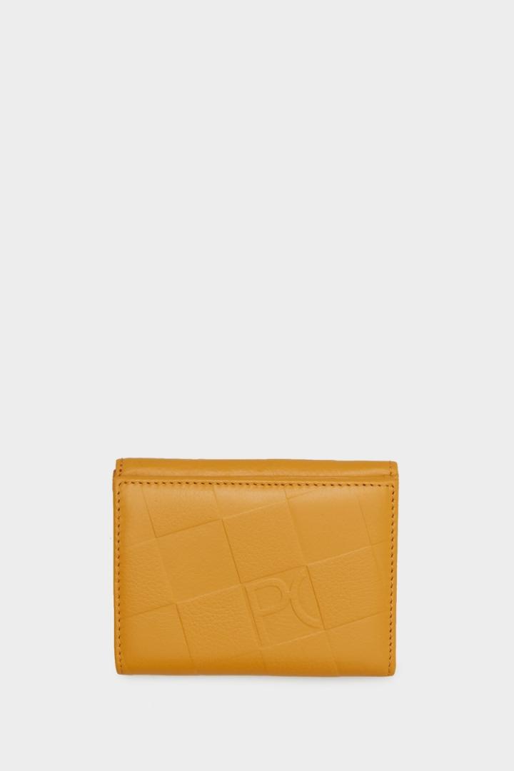 Cartera japonesa en piel con el grabado Stamp de cubos y logos PG. Cierre de solapa con broche e interior con monedero, billetera y cuatro ranuras para tarjetas.