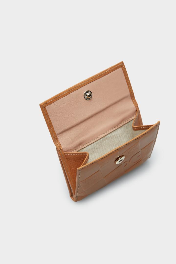 Cartera japonesa en piel con el grabado Stamp de cubos y logos PG. Cierre de solapa con broche e interior con monedero, billetera y cuatro ranuras para tarjetas.