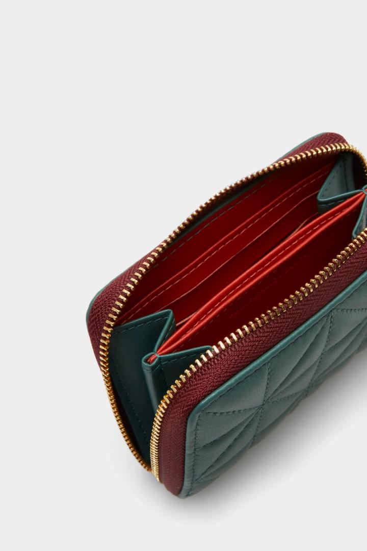 Cartera japonesa en piel napa acolchada con diseño Origami. Cierre de cremallera con tirador de piel a tono. Interior de piel a contraste con dos compartimentos y 2 ranuras para tarjetas.